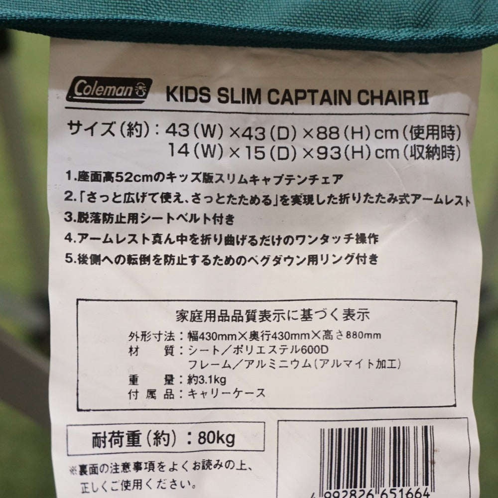 | 商品説明 | コールマンのキッズスリムキャプテンチェアⅡです。 背もたれもグリーンに統一されました。 転落防止ベルト、手すりが付いているのでお子様に安心のキッズ用チェアです。 専用のリングが脚についているためペグを打つことも可能です。 幅43cm×奥行43cm×高88cm(使用時) 座面高さ:52cm 14cm×15cm×高93cm(収納時) 耐荷重:約80kg |