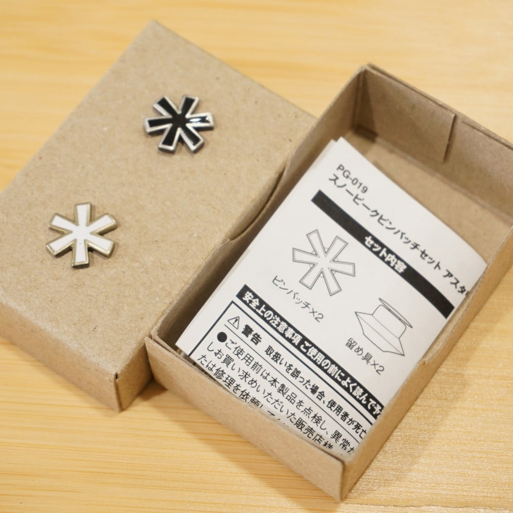 | 商品説明 | スノーピークのポイントギフト、ピンバッジセット アスタリスク/PG-019 です。 リュックや帽子などにアクセントとして付けるアスタリスク型のバッジです。 ・材質:七宝釉薬、丹銅(メッキ加工) ・本体サイズ:13mm×13mm ・重量:2g |