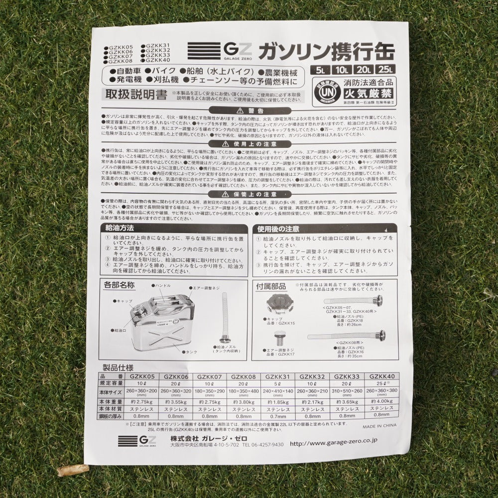 | 商品説明 | ガレージゼロ(GALAGE ZERO)のステンレスガソリン携行缶 10L/GZKK07 です。 草刈機やチェンソーなどの予備燃料を持ち運べるガソリン携帯缶です。 ※給油ノズル(GZKK18)は付属しておりませんので、別途ご用意ください。 |