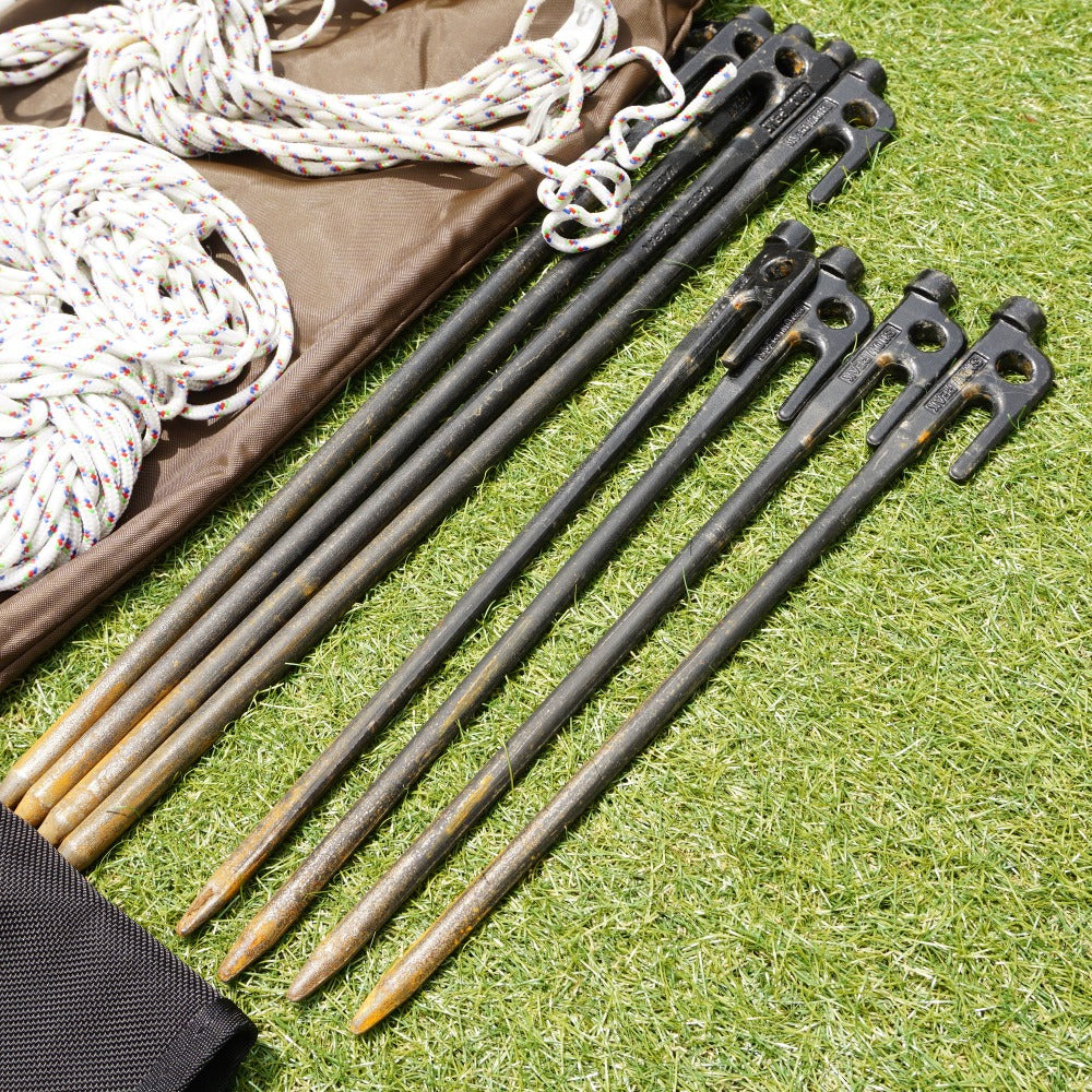 使用感があり、多少の土汚れなども付着していますが、使用に支障のある穴や幕体の劣化などは見られません。 スノーピークのウイングポールは頑丈で、こちらも変形なども見られません。 付属のソリッドステークには若干の錆びが見られます。 |