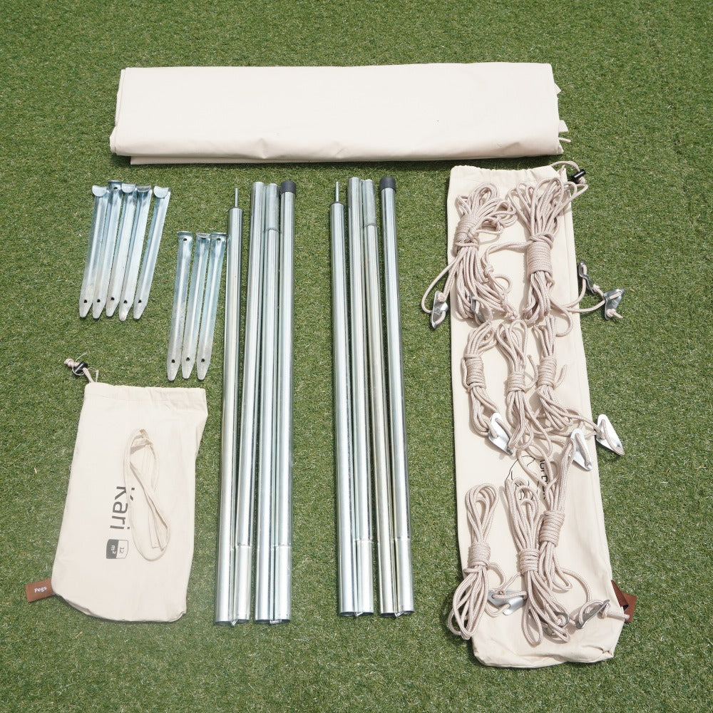 | 付属品 | 収納ケース スチール製V型ペグ8本、ひも、ペグケース、スチール製ポール2本(高さ260cm)、ロープ8本(長:2本(二又用)、短:6本) |