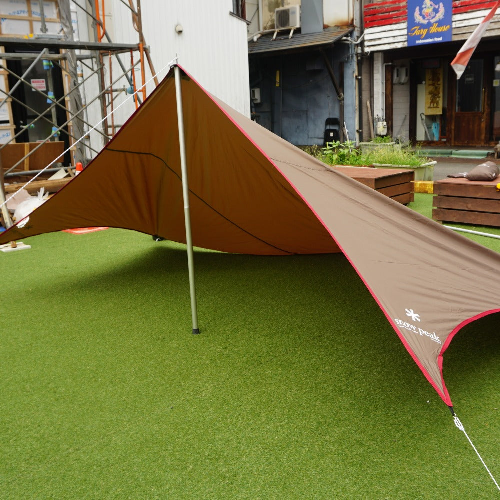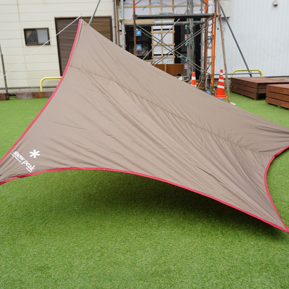 商品説明 | スノーピークのソロ用タープ、ライトタープペンタシールド/STP-381です。 飛行機のようなスマートな形状の小型タープで、パドルやウォーキングポールでもセッティングできます。 ※画像のポールは付属しません |