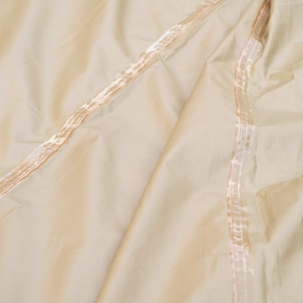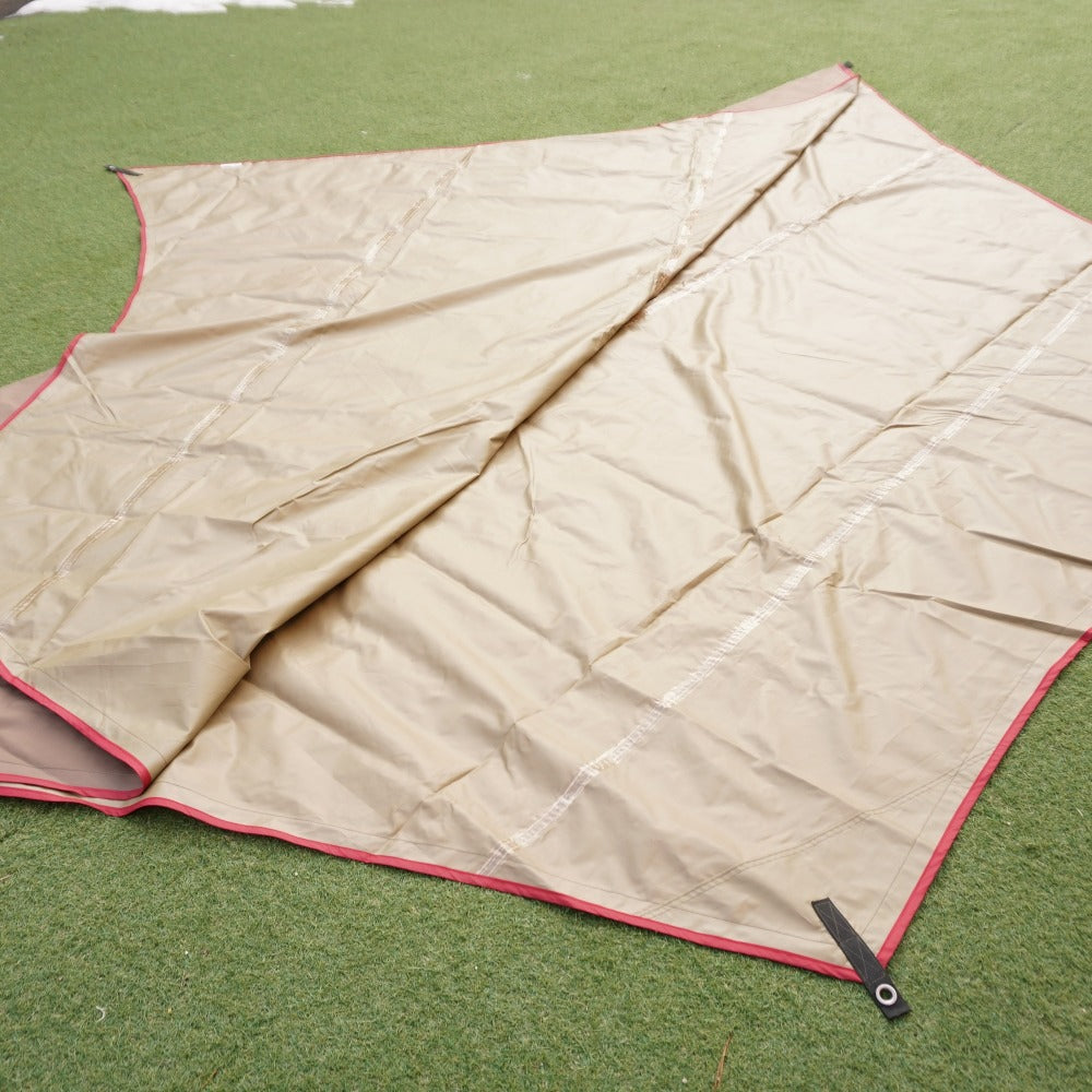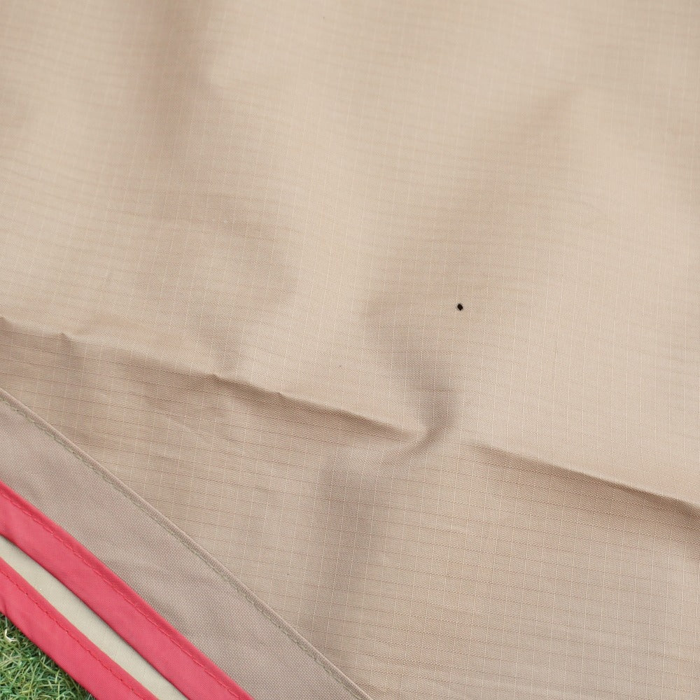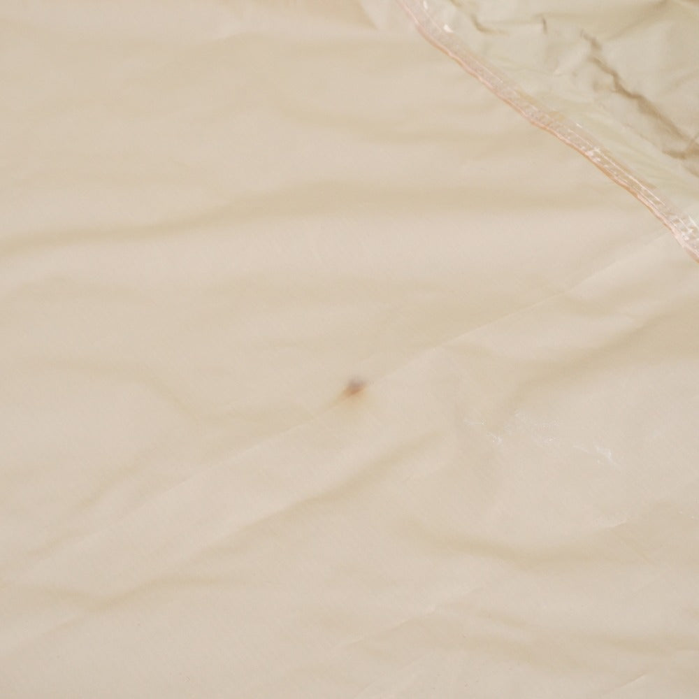 焚火の火の粉と思われる、ごく小さな穴が一ヵ所あり、 タープ裏面に一ヵ所、直径1~2cmほどの焼け跡がございます。 また、シームテープがわずかに浮いてきておりますが、 剥がれや生地のベタツキなどはなく、状態は良好です。 |