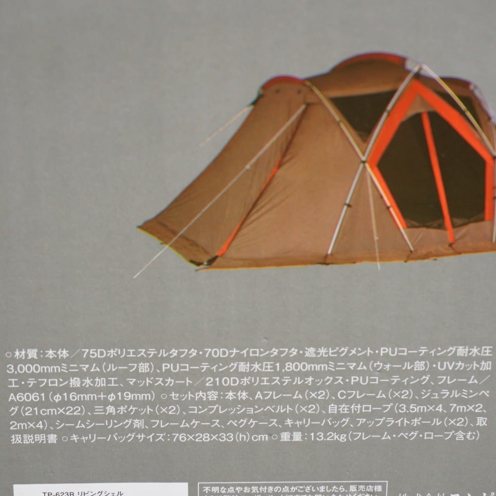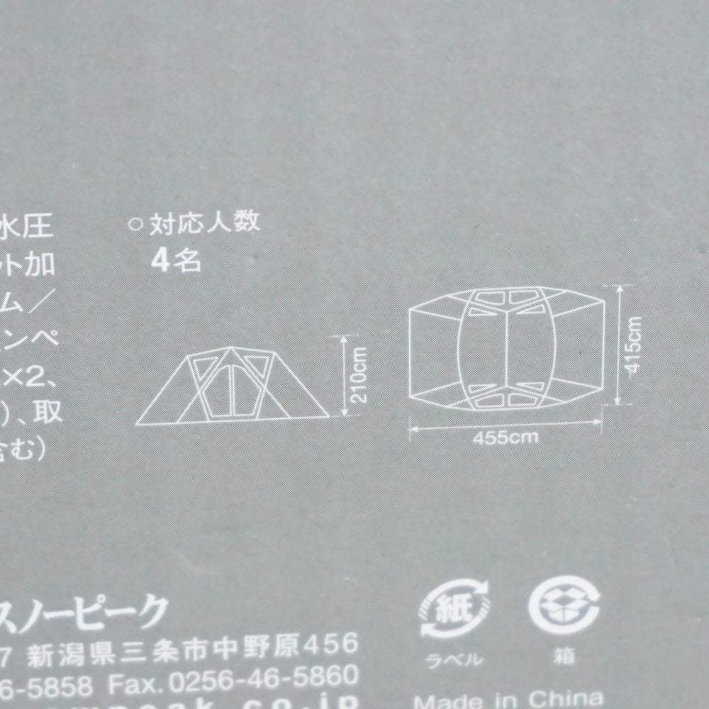 | 付属品 | 収納ケース、外箱 説明書、ジュラルミンペグ(21cm×22本)、コンプレッションベルト×2本、自在付ロープ(3.5m×4、7m×2、2m×4)、シームシーリング剤、フレームケース、ペグケース、キャリーバッグ |