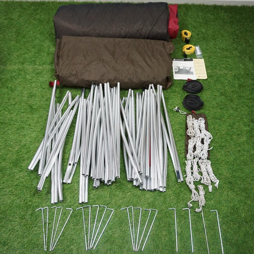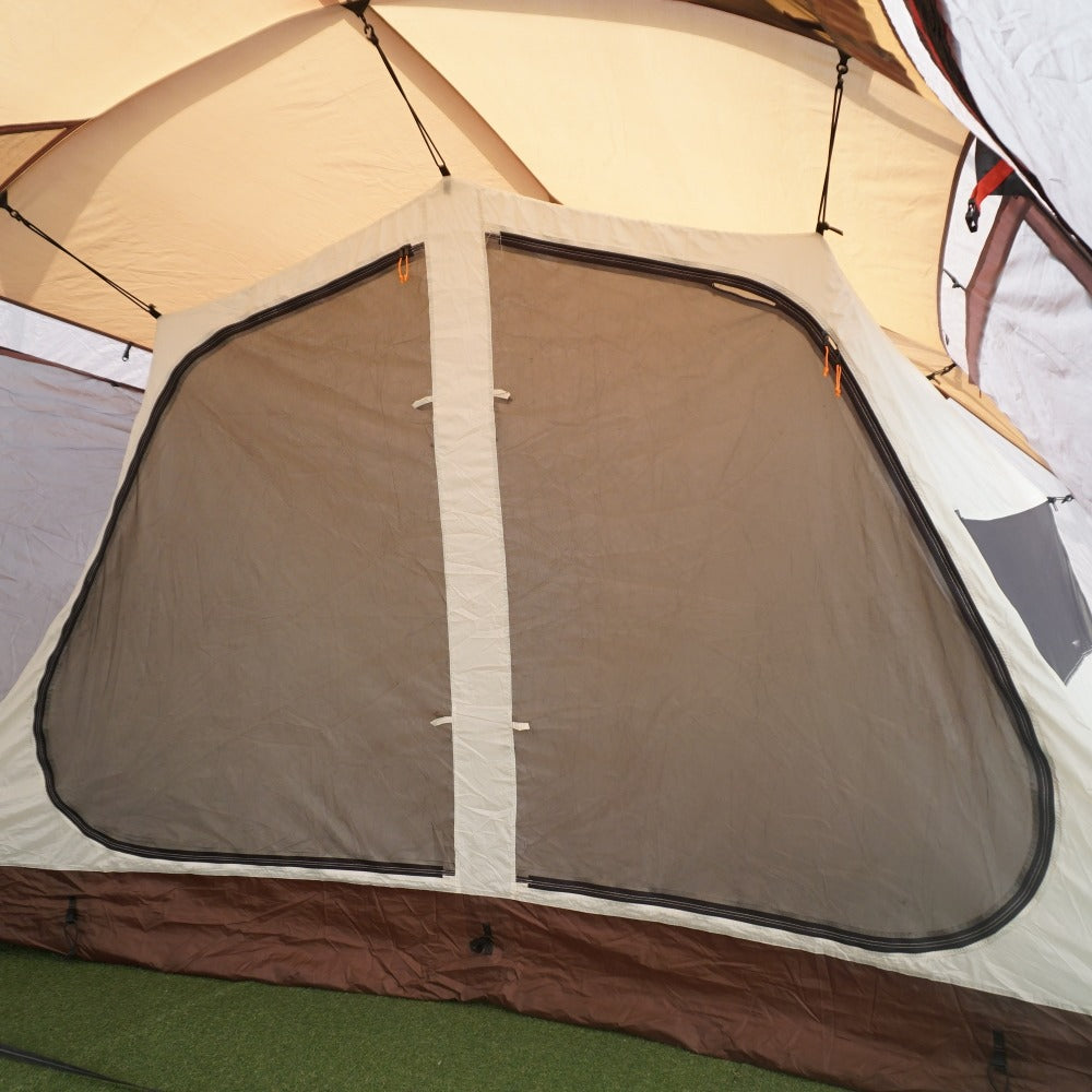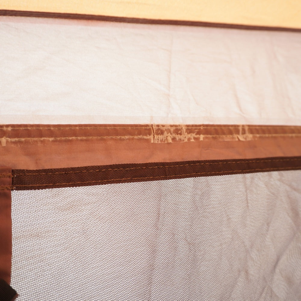 スカート部に1ヶ所、直径3mmほどの破れがある他、薄い土汚れがございます。 また、インナーテント内側とシェルター内側にベタつきがごくわずかにあり、 ドアパネル内側のシームテープに、少し浮いている箇所がございますが、 その他目立った汚れやフレームの変形などなく、状態は良好です。 |