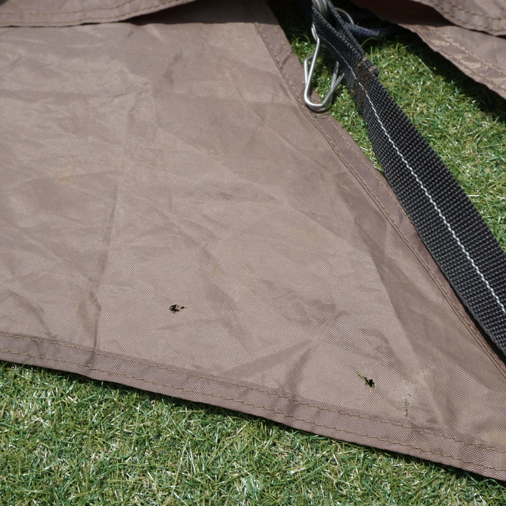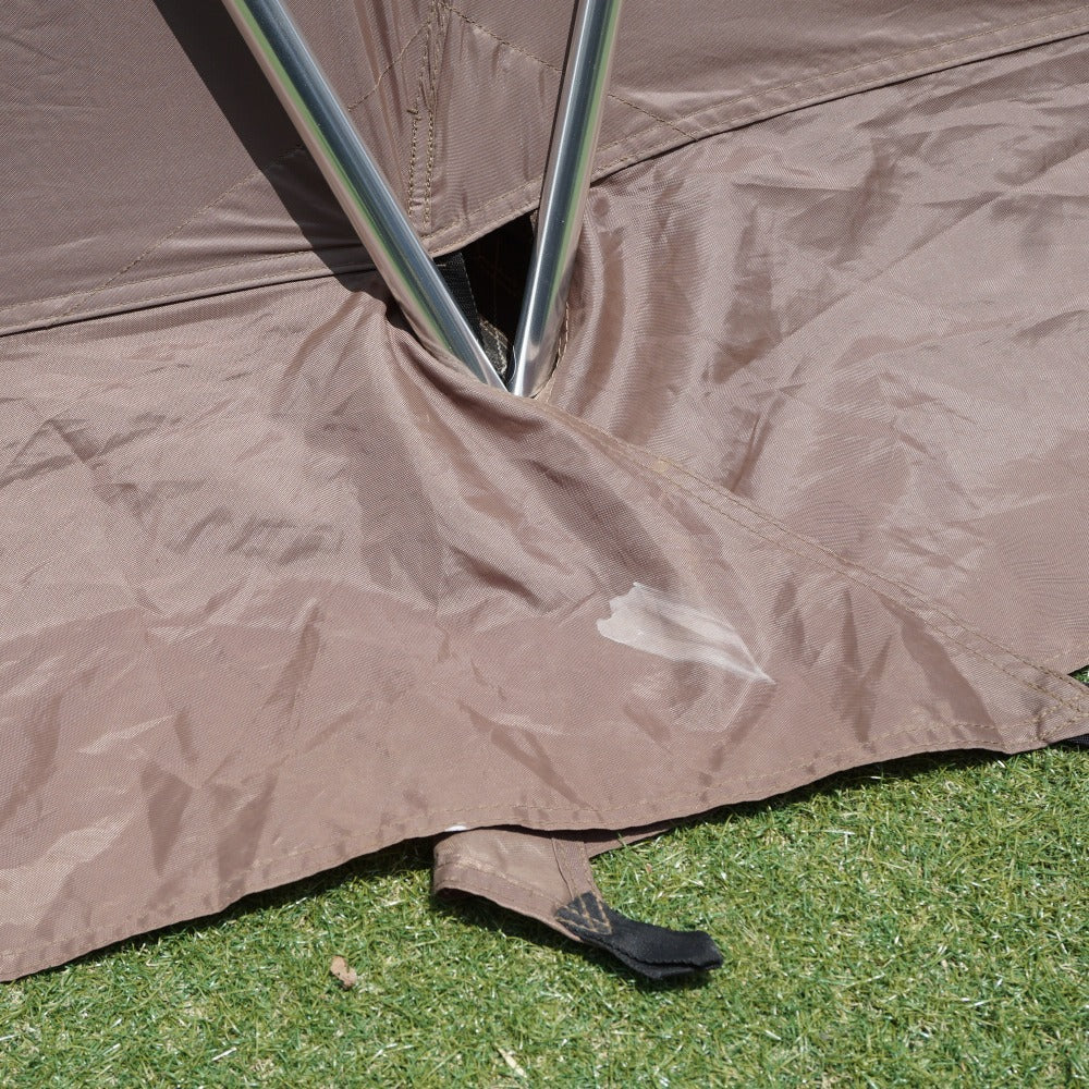 シェルター全体に、わずかに焚火臭がございます。 また、スカート部分とビルディングテープに数か所、薄い土汚れがあり、 スカート部分に2か所、直径1cm以下の穴がございますが フレームはアップライトポール以外は未使用です。 また、幕体にベタツキなどはなく状態は良好です。 当店にて組立確認済みです。 |