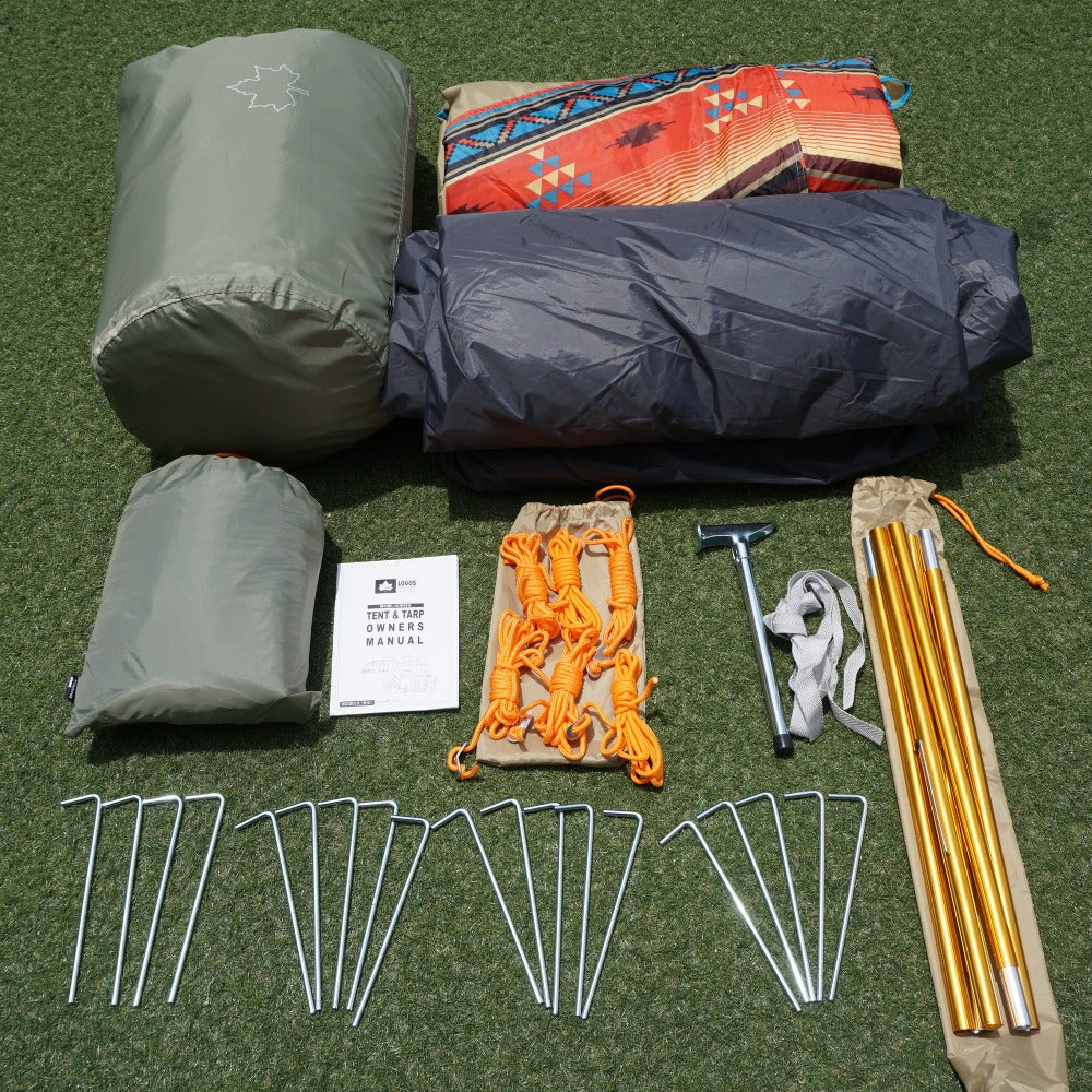 | 付属品 | 収納ケース マット/シート収納ケース、説明書、ペグケース、自在付ロープ6本、ペグハンマー、ひも4本、ポールケース、ピンペグ19本 |