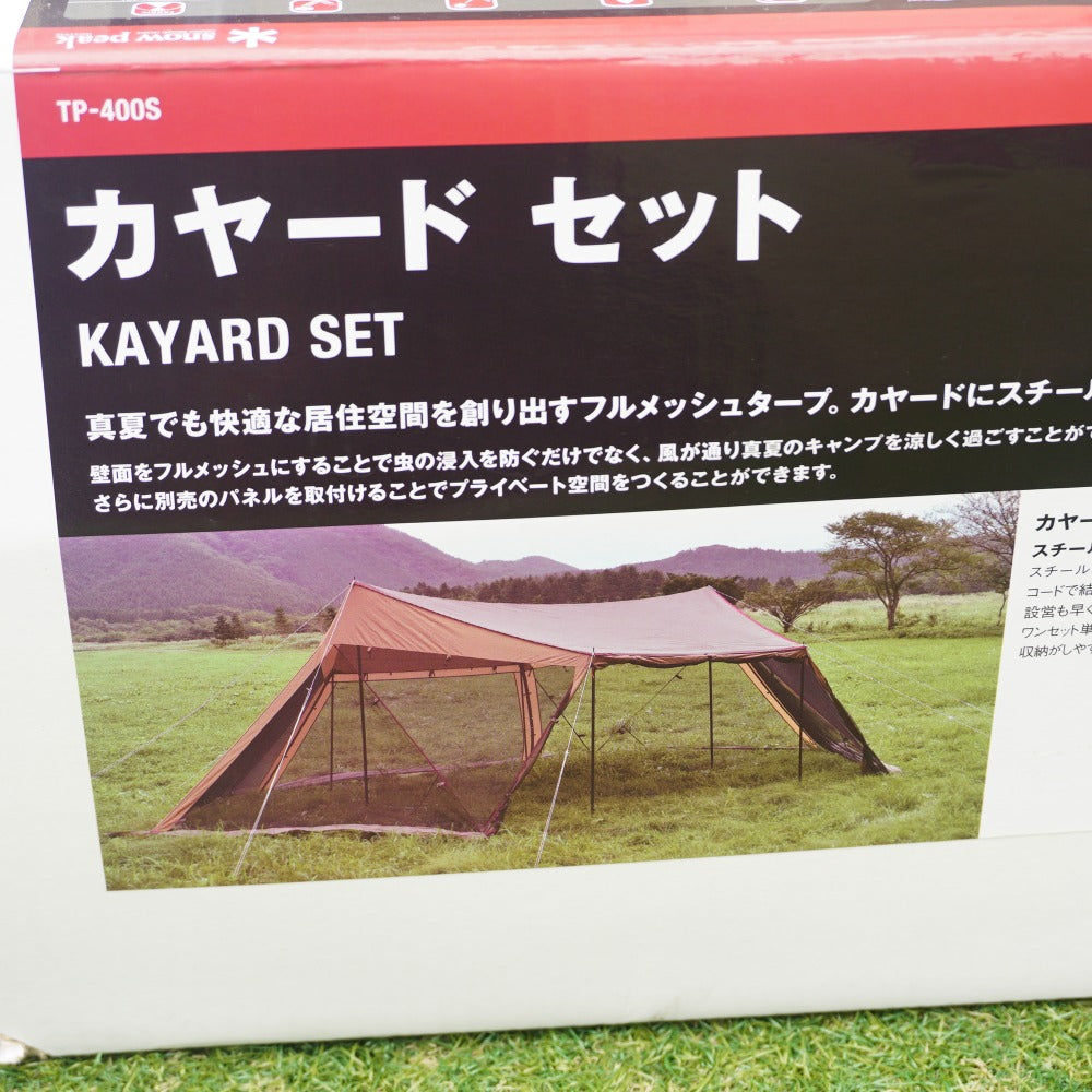 | 商品説明 | スノーピークのカヤードセット/TP-400Sです。 フルメッシュのタープシェルターであるカヤードに、 スチールペグとスチールポールが付属したセット商品です。 現在は廃盤となっているため、大変希少なアイテムです。 |