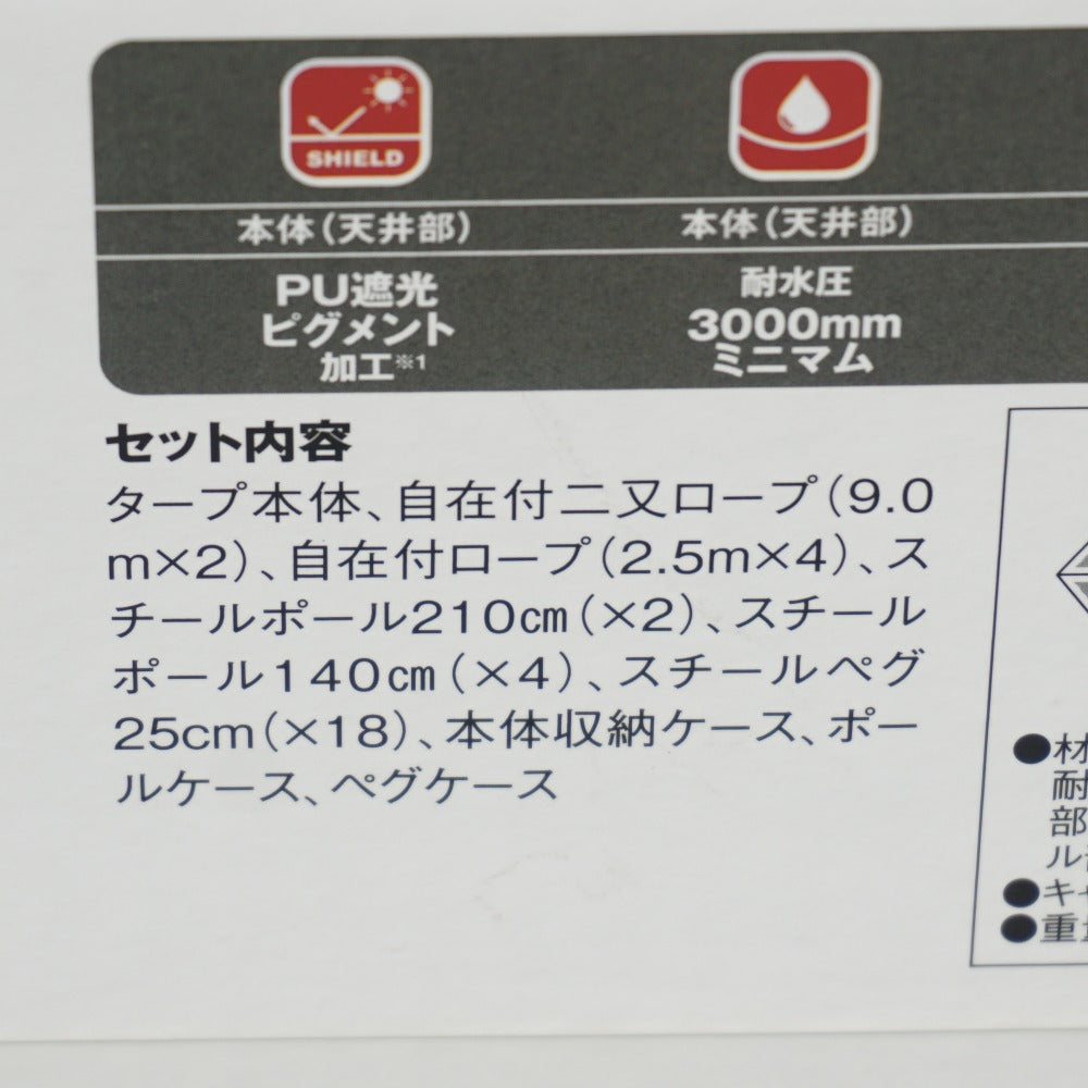 | 付属品 | 収納ケース、外箱 自在付二又ロープ9.0m×2、自在付ロープ2.5m×4、スチールポール210cm×2/140cm×4、スチールペグ25cm×18、ポールケース、ペグケース |
