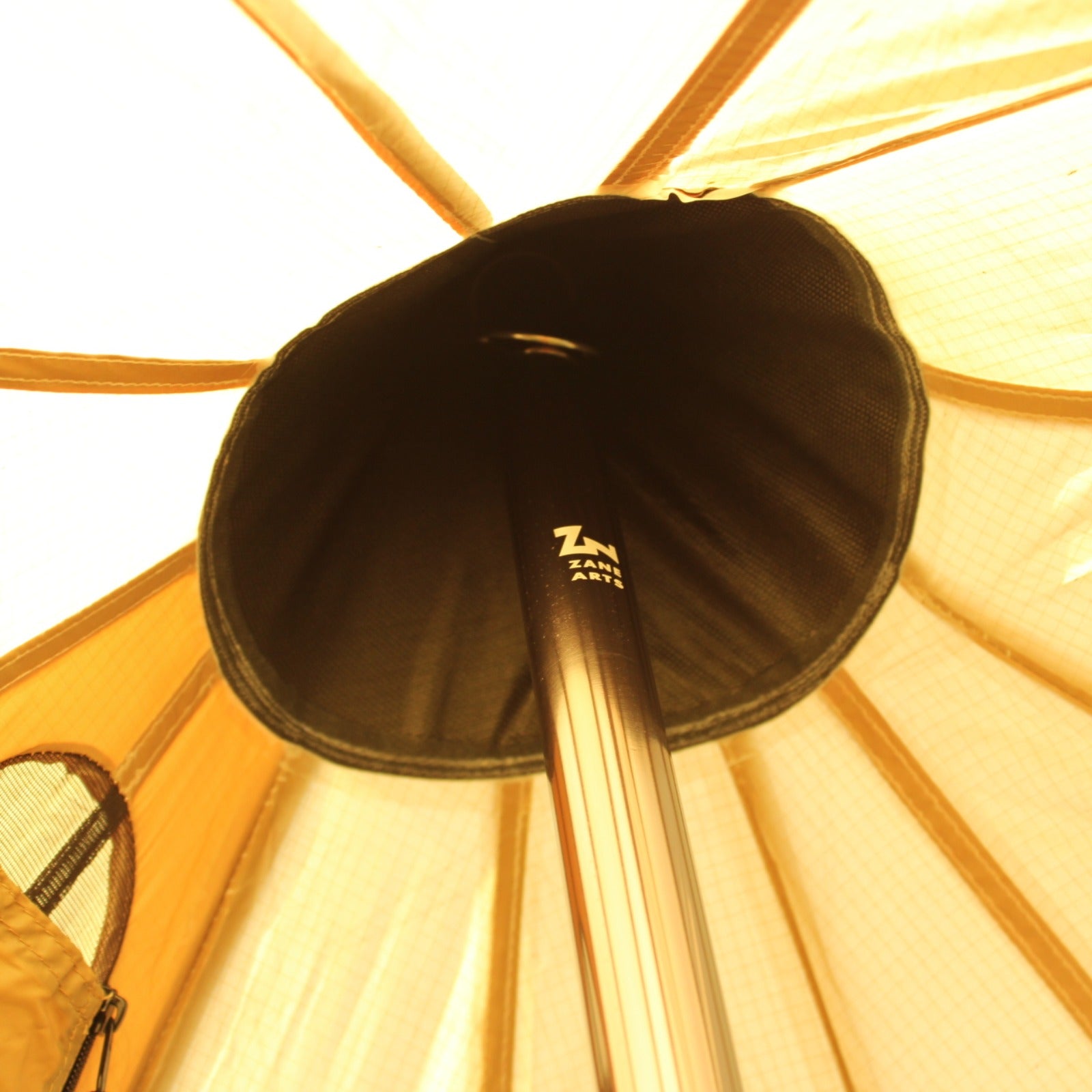 エクステンションフレームで生まれる広い空間と、大胆に開口するパネルで、ワンポールのデメリットを解決したミドルサイズシェルター。