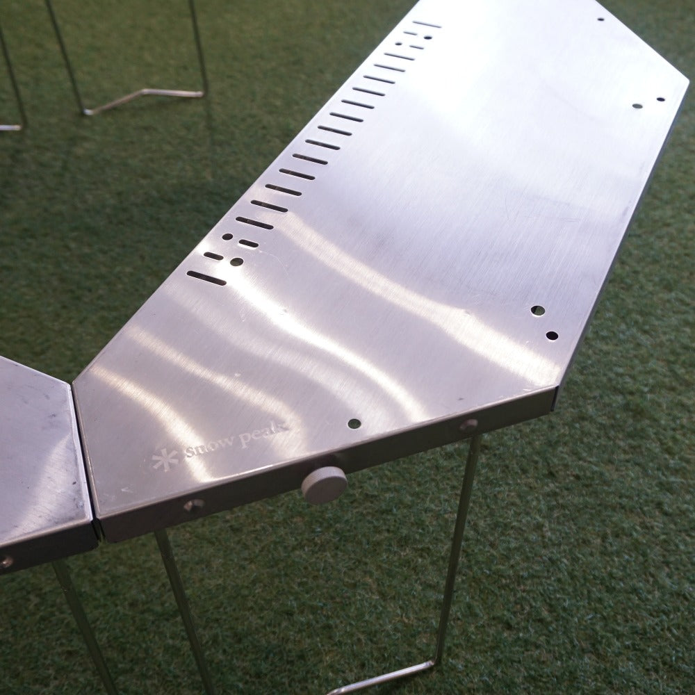 | 商品説明 | スノーピークの焚火用テーブルの定番、ジカロテーブルです。 組み合わせる向きによって、大きさが変えられます。 4つのテーブルユニットを組み合わせて、焚火台や剛炎を囲んで団欒の場を作ります。 テーブルの地上高はローチェア30やベンチにベストな地上高40cmに設定されています。 |