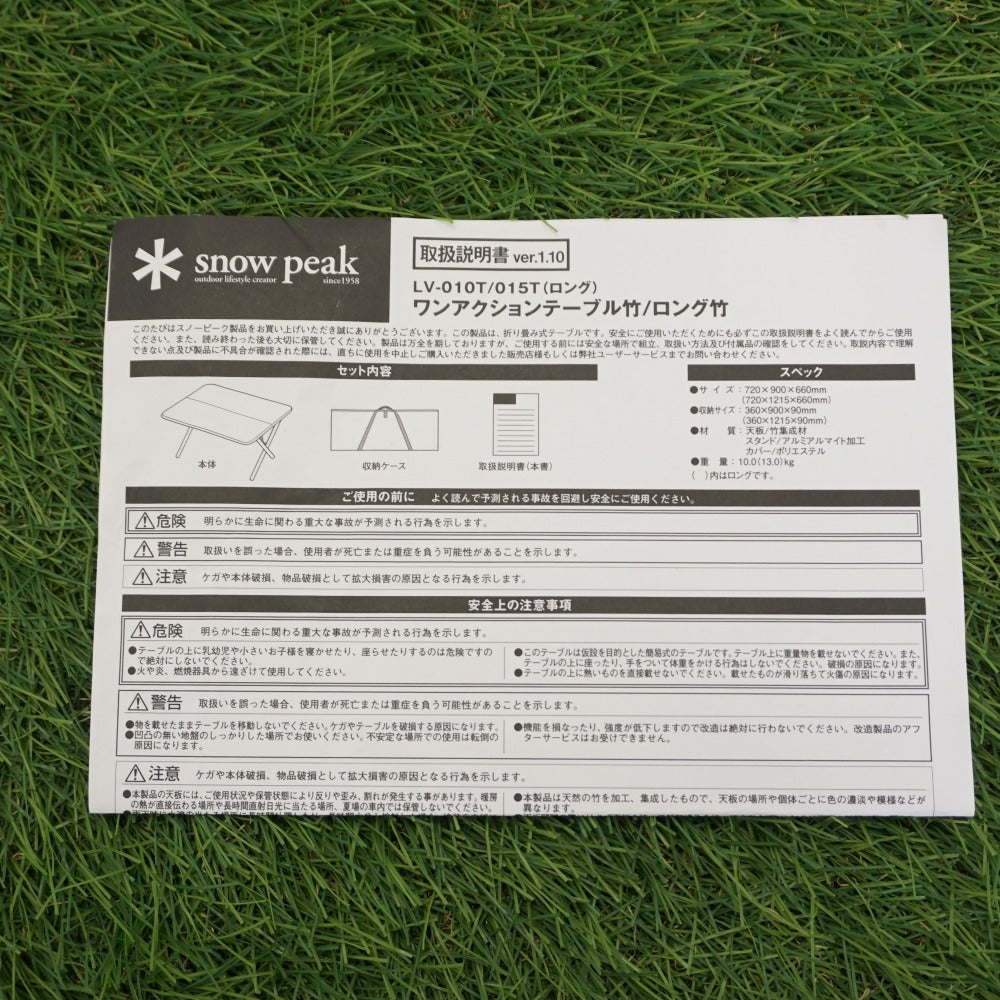 | 商品説明 | スノーピークの定番テーブル、ワンアクションテーブル竹/LV-010Tです。 天板は竹集成材を使用し、滑らかな手触りが特徴です。 ※こちらは旧品番となりますので 現行品番(LV-010TR)より色味が少し薄く、 長辺のサイズは現行品番より1cm長くなっております。 ■サイズ:720×910×660(h)mm ■収納サイズ:360×910×90mm |