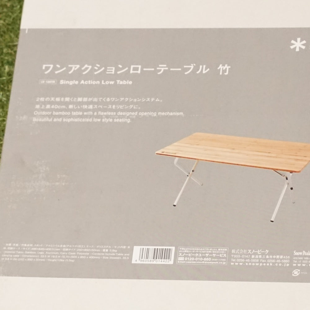 | 商品説明 | スノーピークのワンアクションローテーブル竹/LV-100TR です。 折り畳まれた2枚の天板を開くと脚部が中から現れるワンアクションセッティングのテーブルです。 地上高40cmのロースタイルに最適な高さとなります。 ジカロテーブルやIGTなどとも相性が抜群です。 |