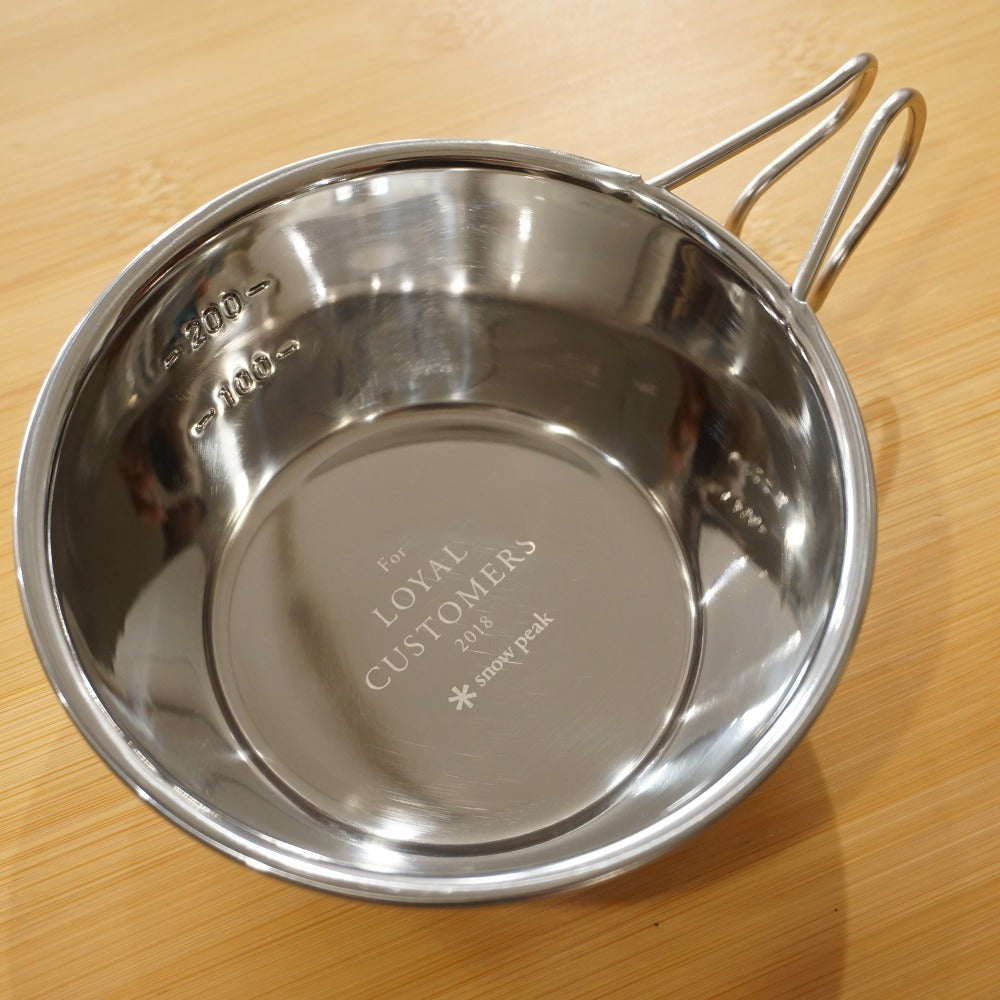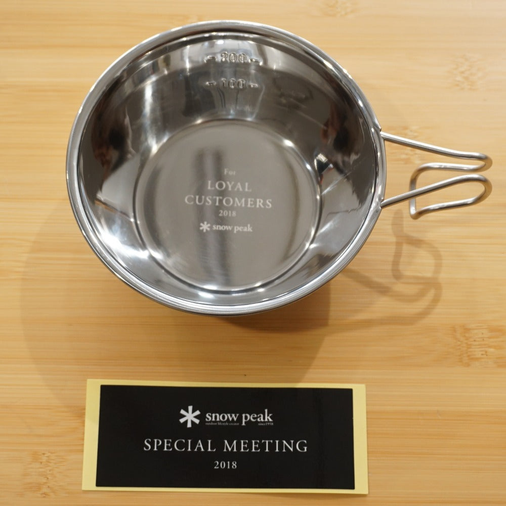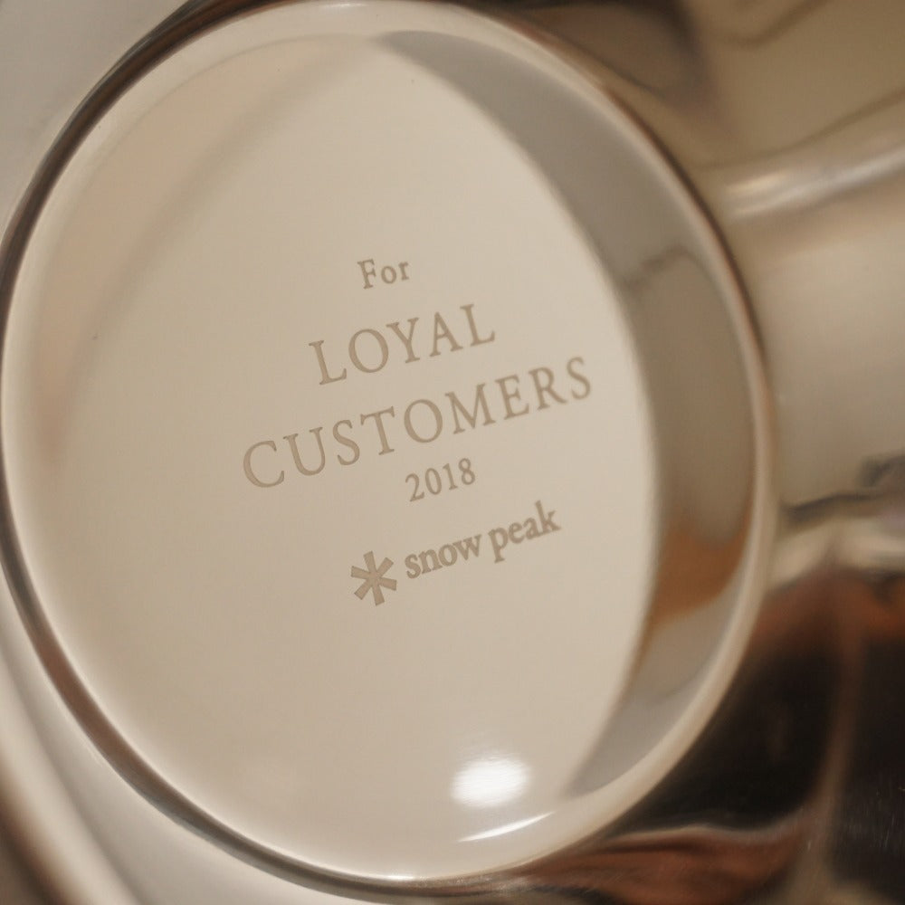 | 商品説明 | スノーピークのロイヤルカスタマーミーティングの記念品です。 ミラーポリッシュ加工されたシェラカップで、底に記念のレーザーマーキングが施されています。 |