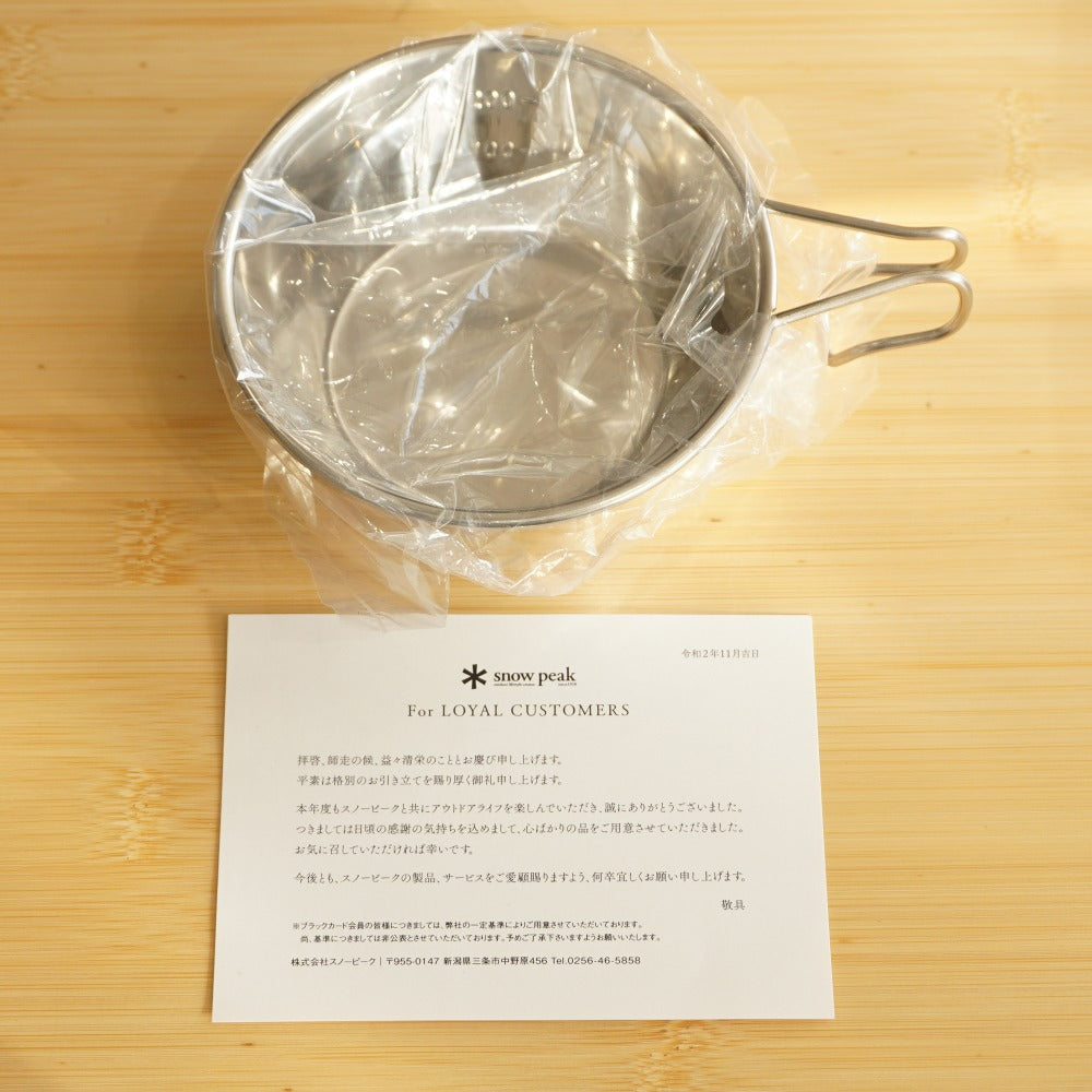 | 商品説明 | スノーピークのロイヤルカスタマー向けの記念品です。 ミラーポリッシュ加工されたシェラカップで、底に記念のレーザーマーキングが施されています。 |
