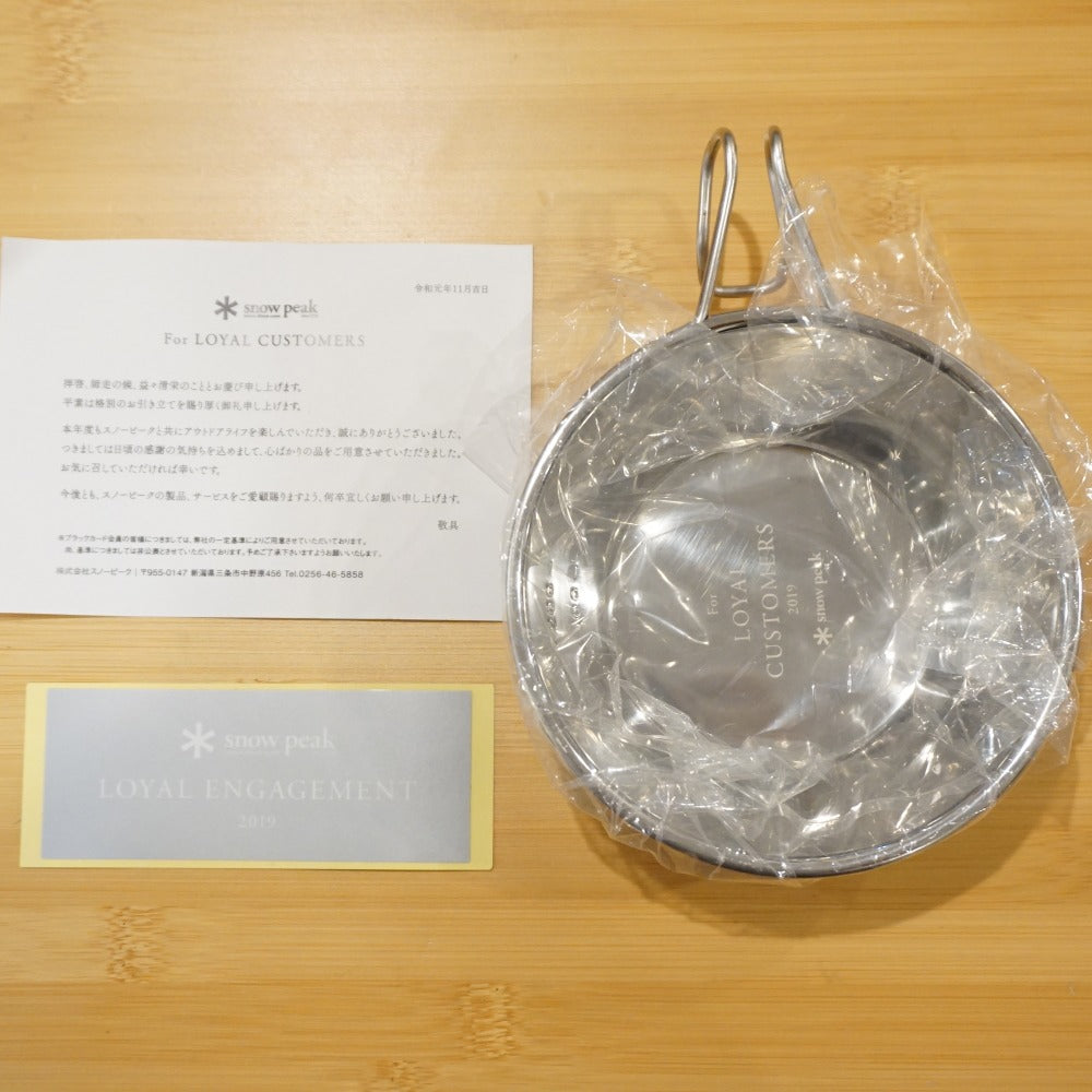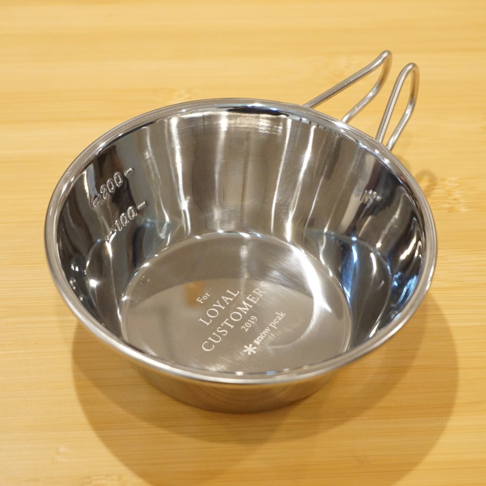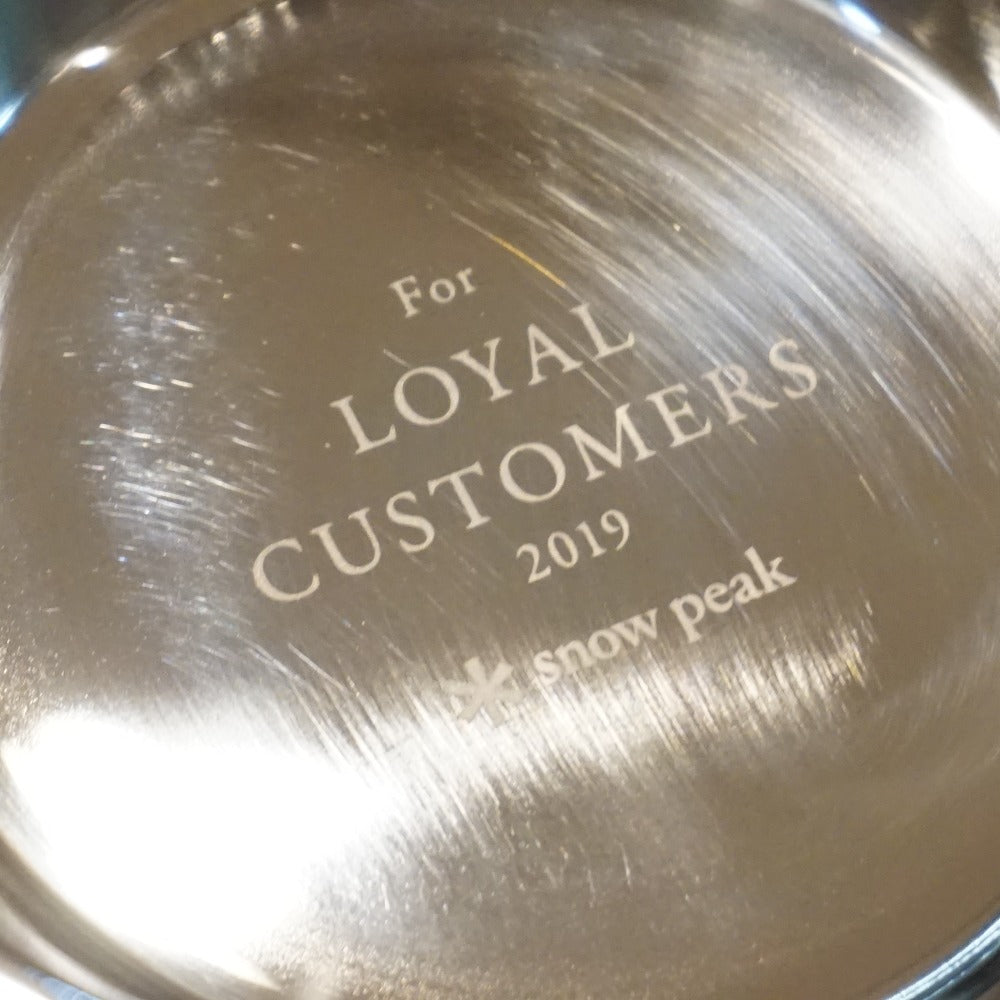 | 商品説明 | スノーピークの2019年度ロイヤルカスタマーミーティングの記念品です。 ミラーポリッシュ加工されたシェラカップで、底に記念のレーザーマーキングが施されています。 |