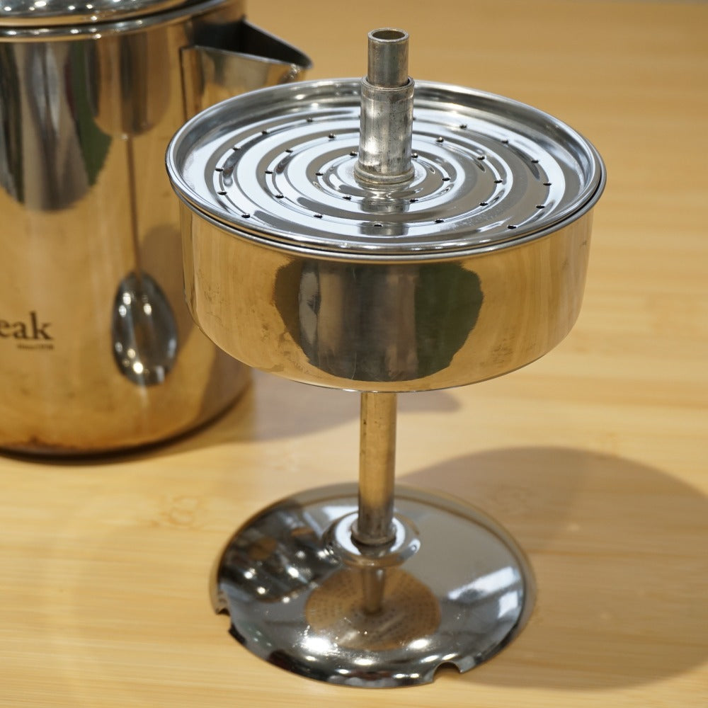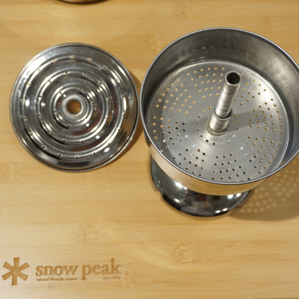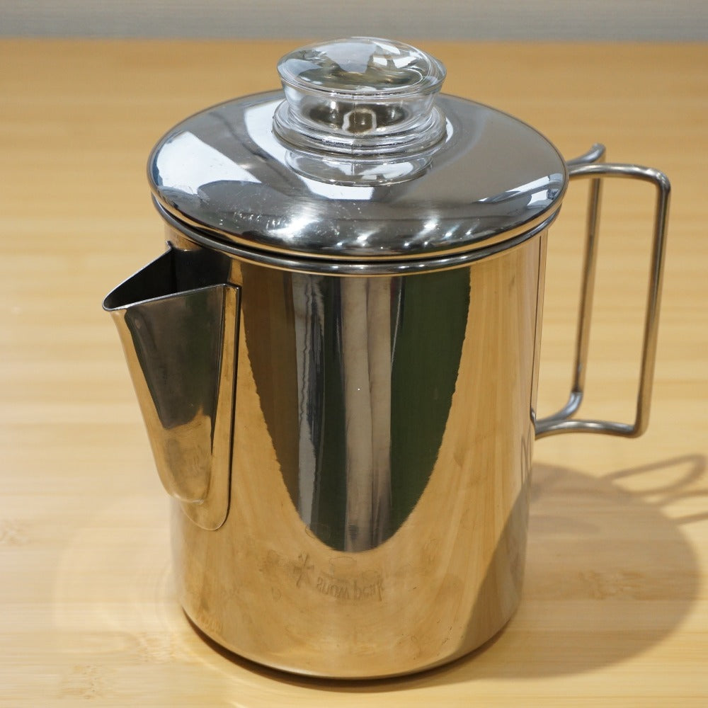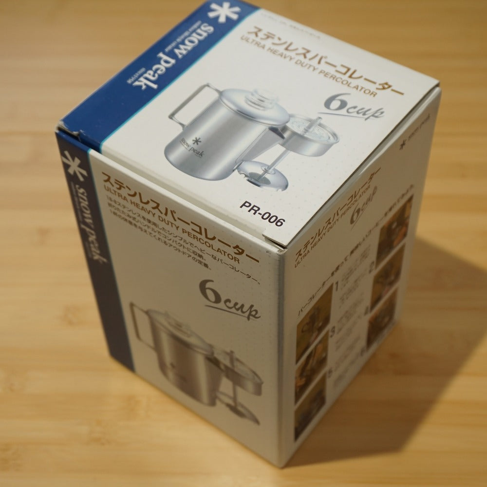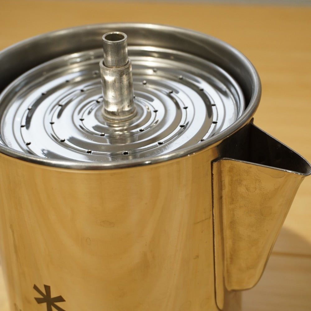 商品説明 | スノーピークのステンレスパーコレーター6カップ/PR-006です。 パーコレーターは通常のポットとは違い直火でお湯を沸かしそのままコーヒーを作れる構造です。 抽出中、蓋のガラス部分から中を覗き、色合いを見て濃さを判断します。 フィルターペーパーを使わないので豆は中挽きか粗挽きがおススメです。 焚火にも耐えるステンレス製のパーコレーターで、もちろんケトルとしてもお使い頂けます。 容量:900ml |