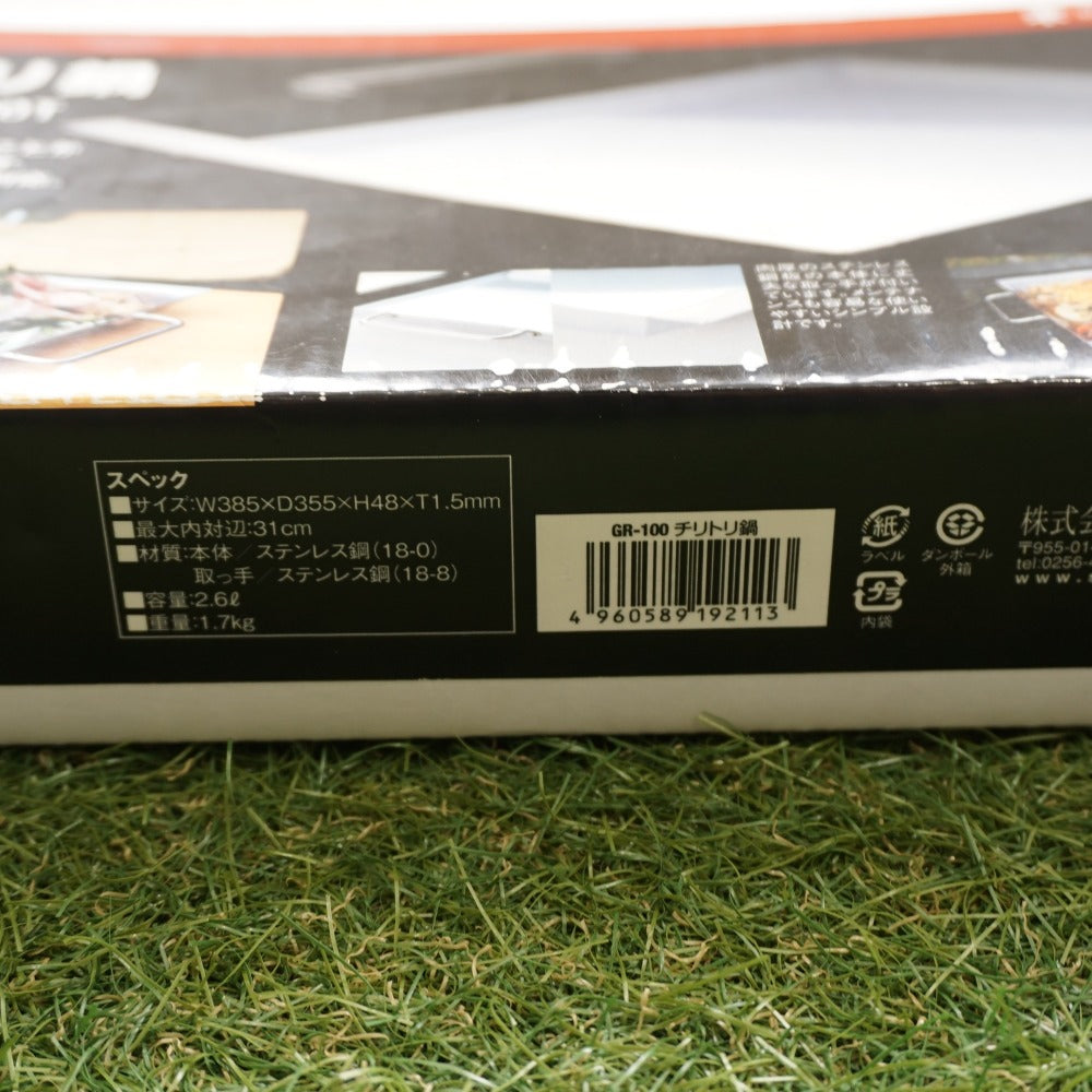 商品説明 | スノーピークのチリトリ鍋/GR-100です。 キャンプでも本格的なすき焼きやモツ煮が楽しめます。 ちりとりの形状をした底の浅い四角い鍋です。 焚火台L,MやリフトアップBBQ-BOXにセットできるシステムデザイン。 サイズ:W385×D355×H35mm |