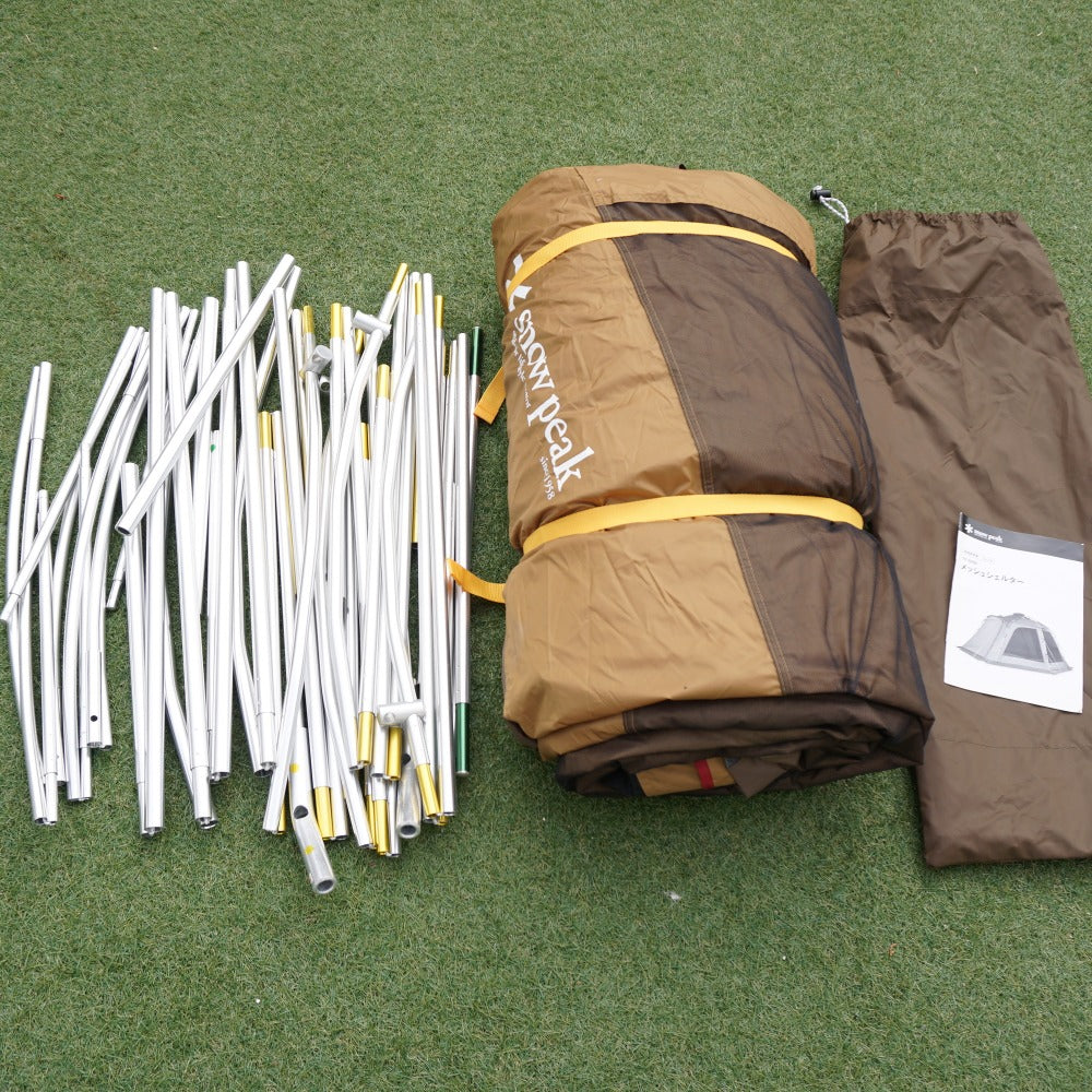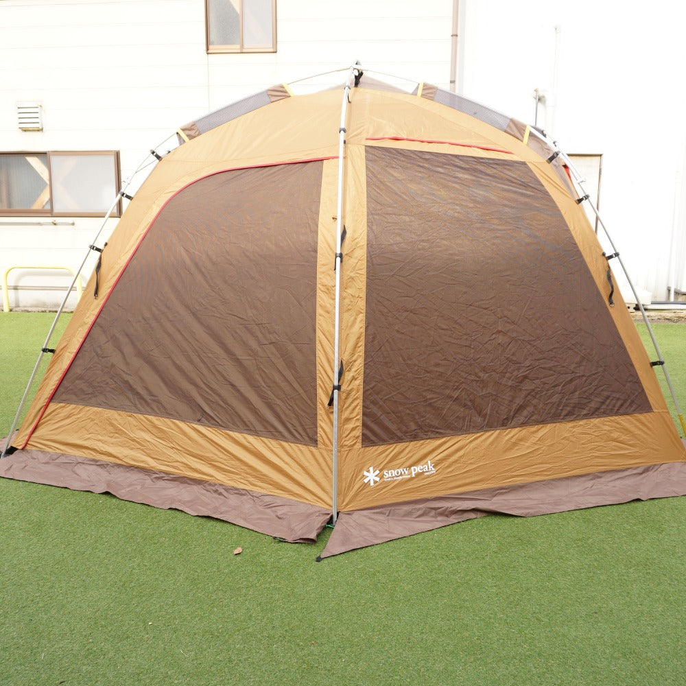 商品説明 | スノーピークの大型メッシュ採用のシェルター、メッシュシェルター/TP-920Rです。 現行のTP-925の一世代前ですが、値段も手ごろでとても人気のあるアイテムです。 入口パネル含め、各ウォールにメッシュパネルを備えたシェルターです。 高さも210cmありますので、大人でもストレスなく過ごす事が可能です。 また、オプションのメッシュシェルタートンネルを使うとアメニティドームなどとの連結が可能です。 |