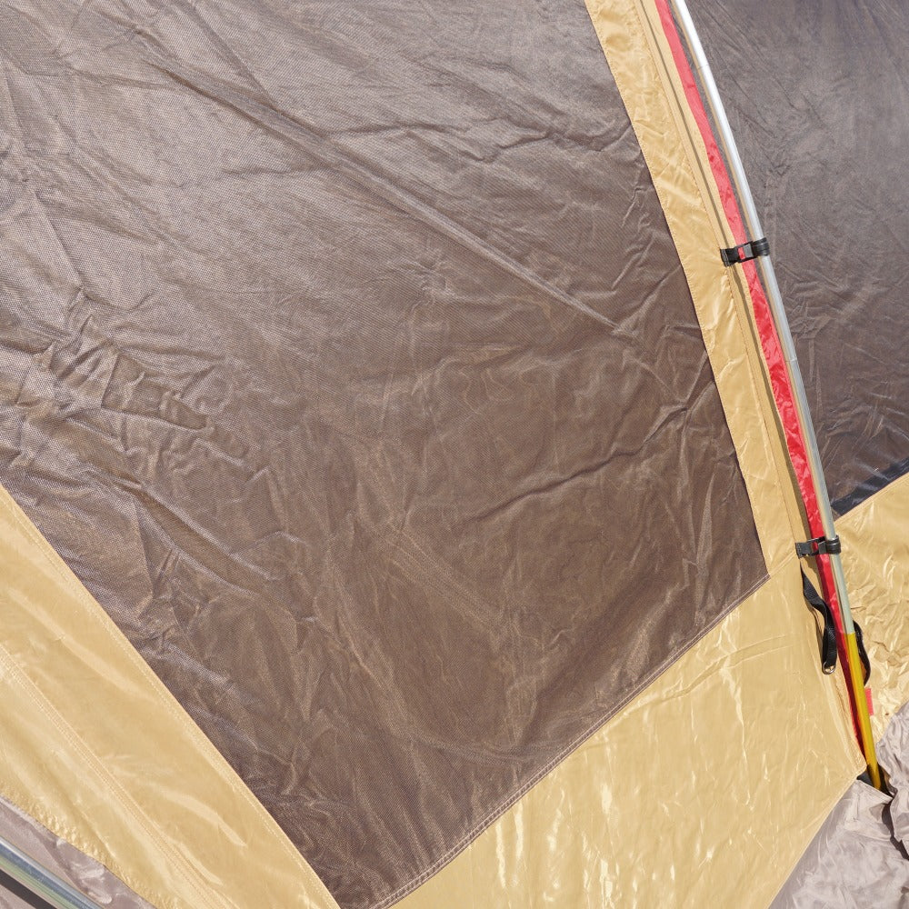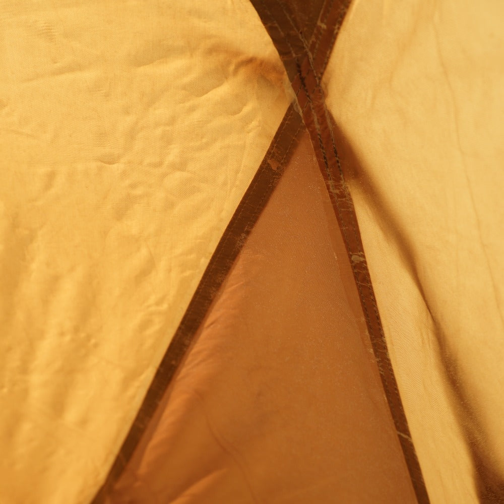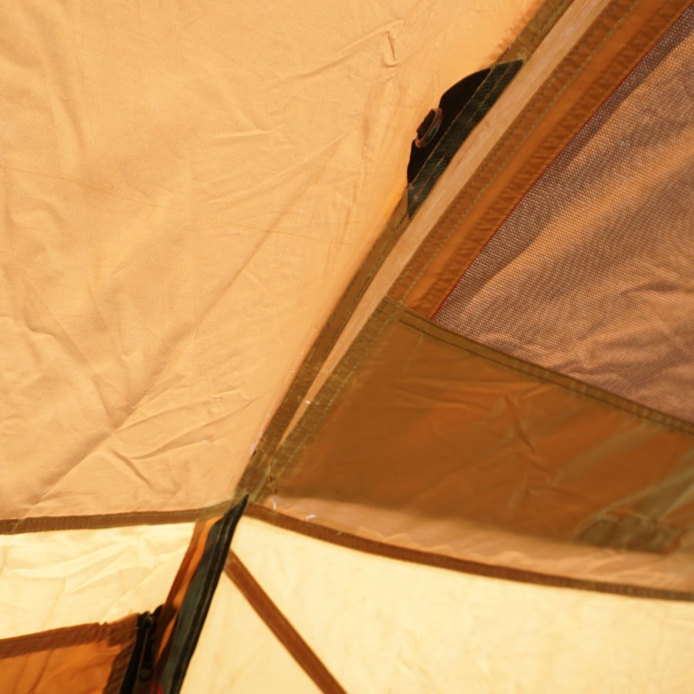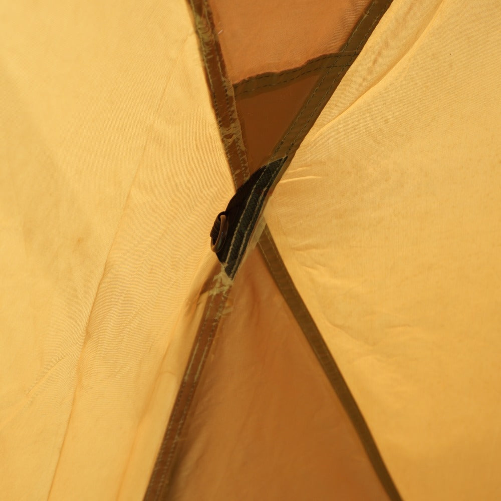 古いアイテムのため、幕体内側のコーティングが経年劣化によるベタツキが発生しています。 また、インナーテントフロアも少々ベタツキを感じます。 シームテープなども劣化による剥がれが生じていますが、幕自体の穴や目立つキズ、破れなどはございません。 接地するスカートなども綺麗です。 フレームなどは使用に支障のある変形や歪みはありません。 |