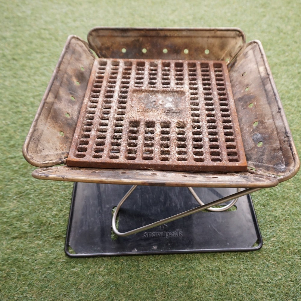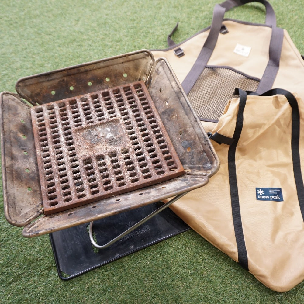 使用していたアイテムのため、焦げやキズ、変色などございますが、スノーピークの焚火台は頑丈なステンレス製のため、焚火台本体の錆びや破損などはございません。 炭床には錆びは見られますが、強度の問題はありません。 コンプリート収納ケースにも使用に支障のある穴や破れなどありません。 |