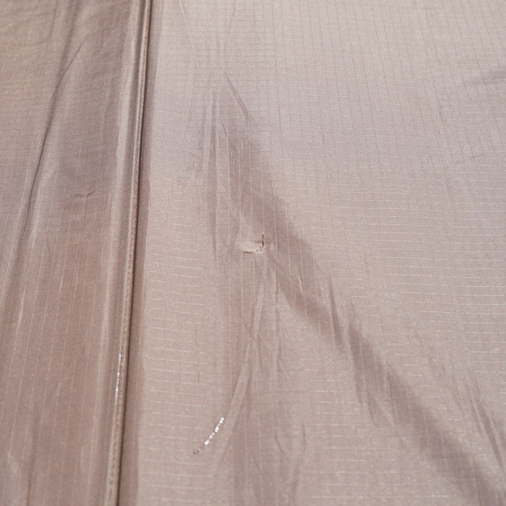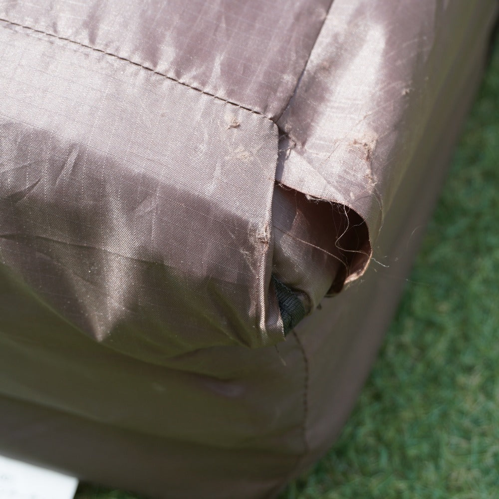 使用感及び一カ所薄っすらと目立つシミございます。 また、1cm程度の裂けも見られますが、通常使用には気にならない程度です。 収納袋にほつれによる破れございますが、その他裏面の破れなどもなく、大型なマットとして快適にお使い頂けます。 |