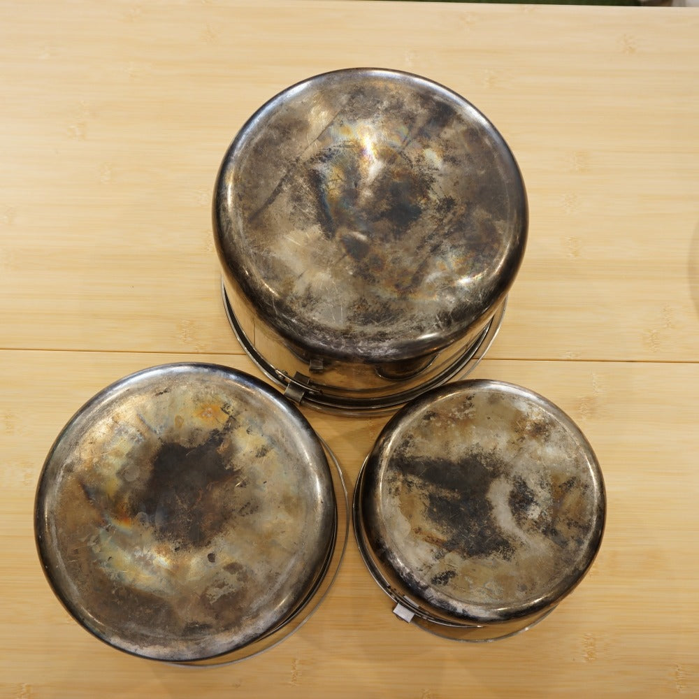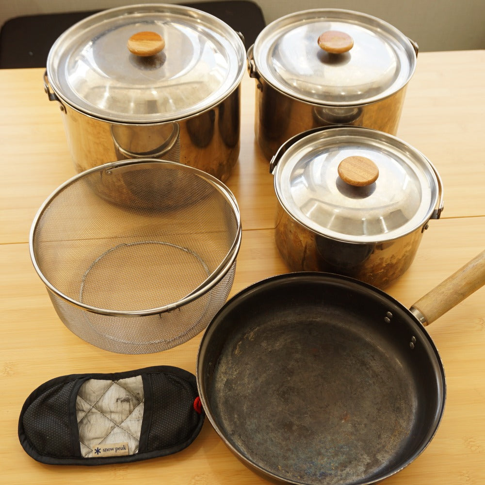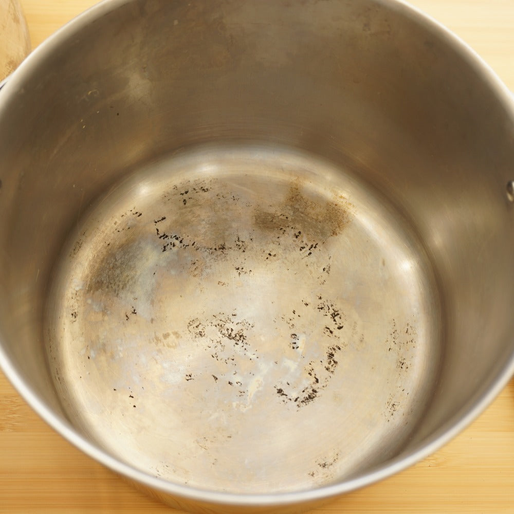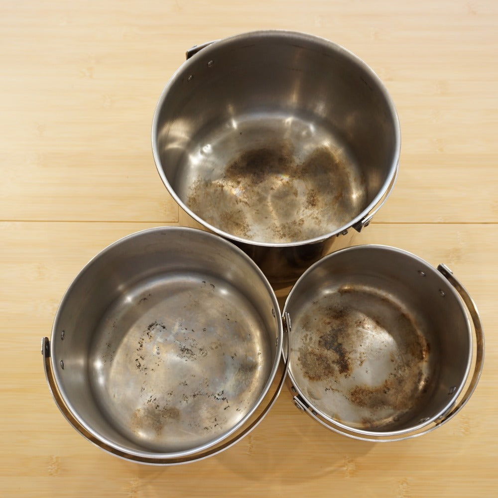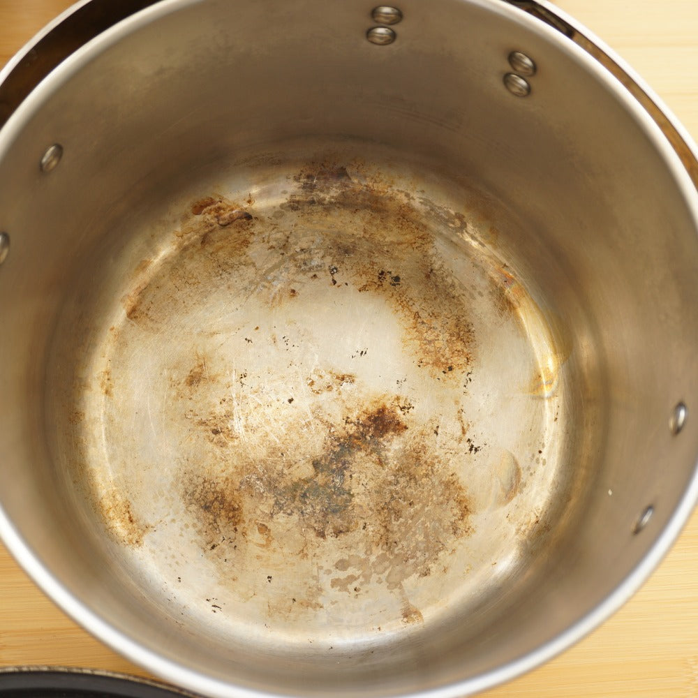 鍋やフライパンの底に焦げ付きが見られます。