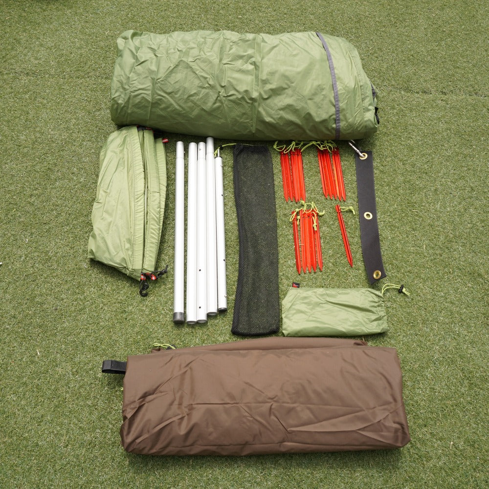 付属品 | 収納ケース Yペグ16本、ペグケース、フレームケース、上部キャップ、カラビナ1つと部品 |