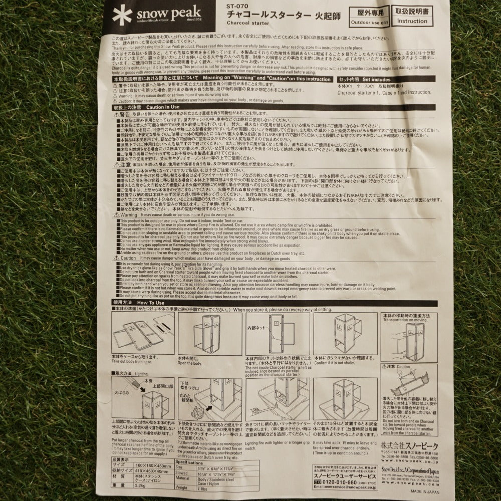 商品説明 | スノーピークのチャコールスターター火起師/ST-070です。 既に廃盤となり希少なアイテムです。 サイズ:160×160×450mm(使用時) 収納サイズ:450×450×40mm |