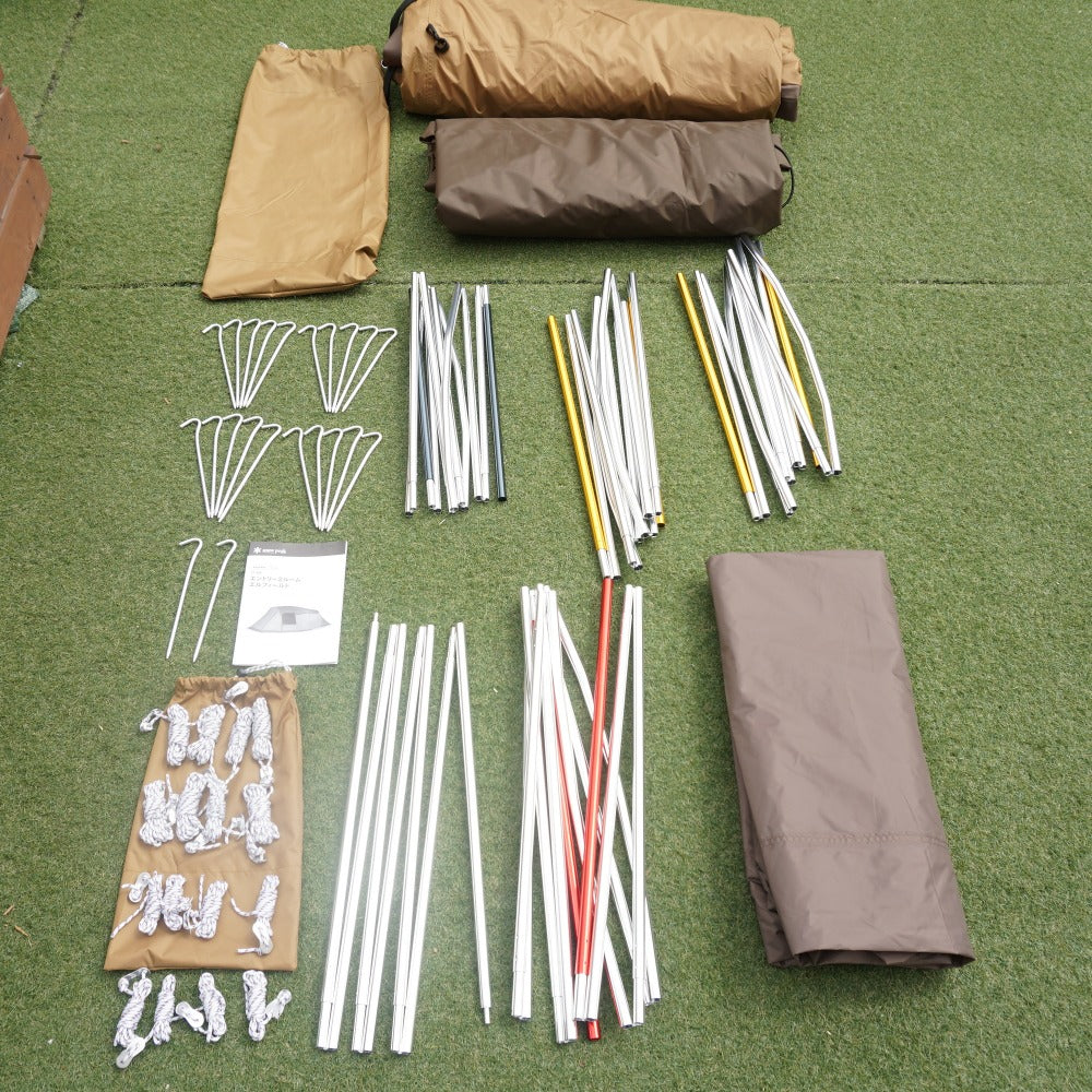 付属品 | 収納ケース フレームケース、ジュラルミンペグ22本、説明書、ペグケース、自在付ロープ16本(2.5m×8/1.5m×8)、ルーフシート |
