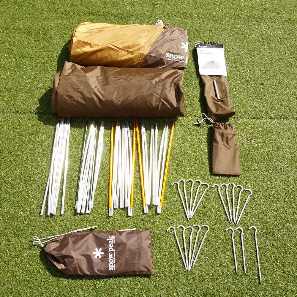 付属品 収納ケース 説明書、リペアパイプ、フレームケース、ペグケース、ジュラルミンペグ18本(内1本長め)、グランドシート収納ケース