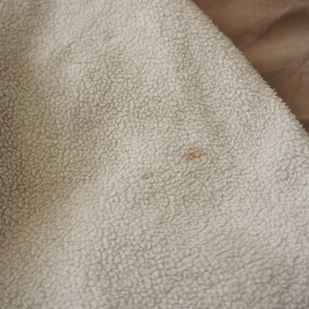 着用感があり、一カ所1cm程度のシミがございます。 その他、古着となりますのでピリングや汚れ、色あせなどございます。 |