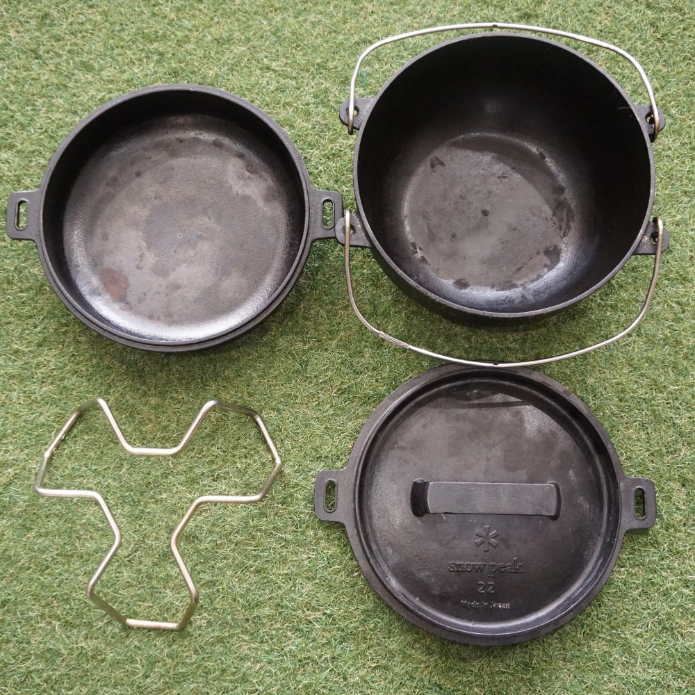 商品説明 | スノーピークの和鉄ダッチオーブン22/CS-510と専用収納ケース、 リフターPro/N-021、チャコールスタンド/CS-512のセットです。 和鉄ダッチオーブンは燕三条の技術を結集させた、極薄・軽量ダッチオーブンです。 ポット、スキレット、蓋の3点セットで調理の幅も広がります。 リフターProは、調理中、ダッチオーブンが熱くなっている状態で、 フタの開け閉めができる便利なリフターです。 チャコールスタンド22は和鉄ダッチオーブン22専用の安定感のあるスタンドです。 |