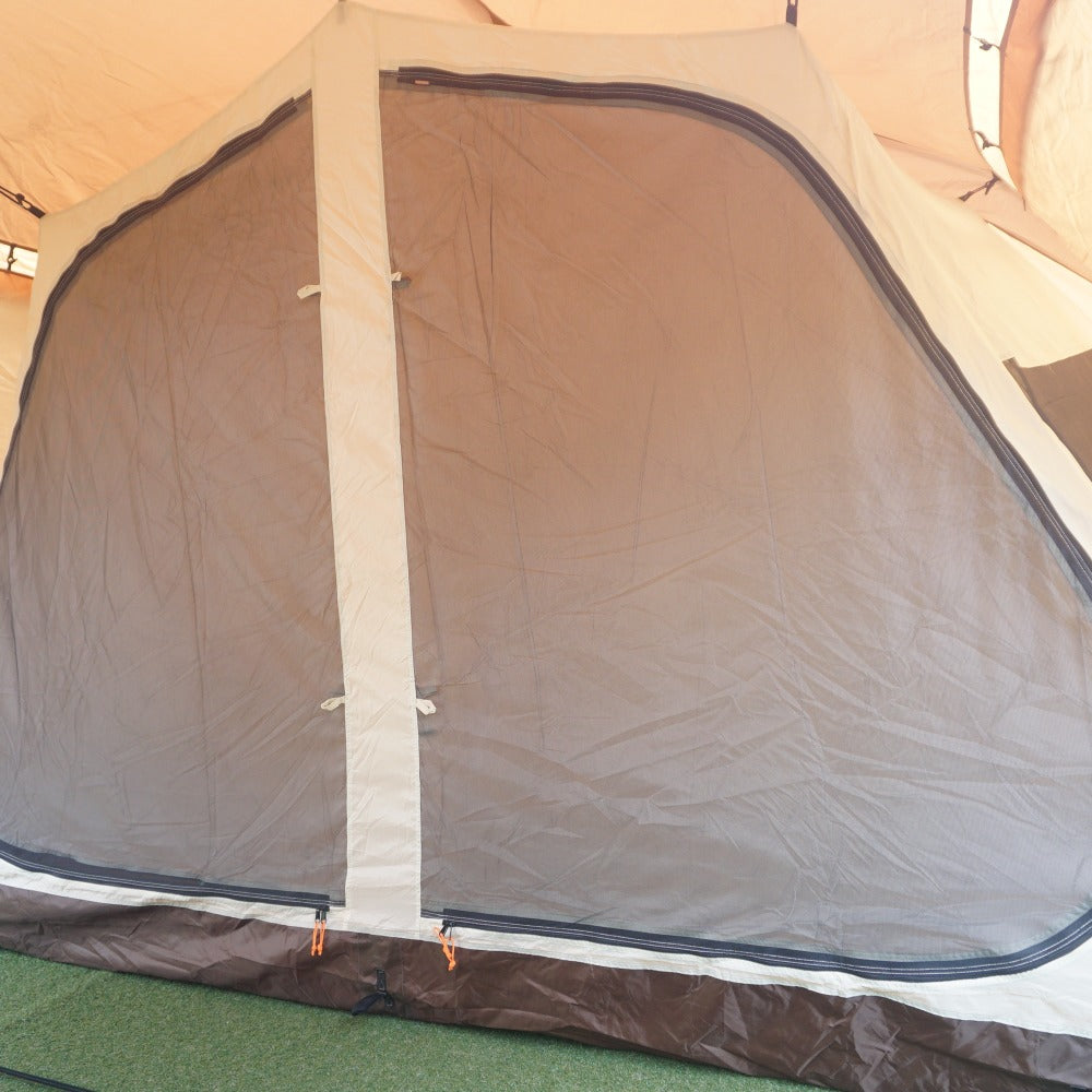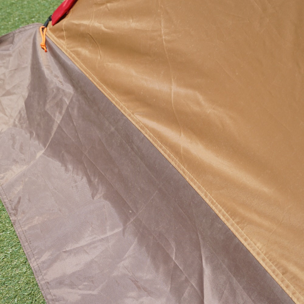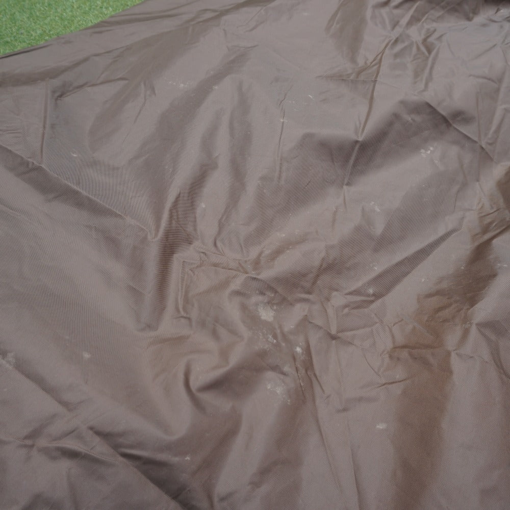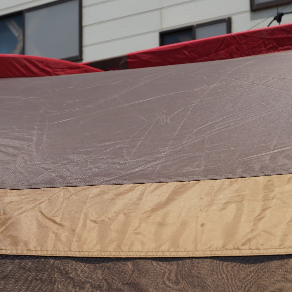 インナーテントのボトムやシェルターの側面・スカート部に薄い土汚れがあり、 フレームを通すスリーブ表面やシェルター内側の天井に、 生地劣化による薄い汚れはございますが、 フレームの変形やベタツキなどはなく、当店にて設営も確認できました。 |