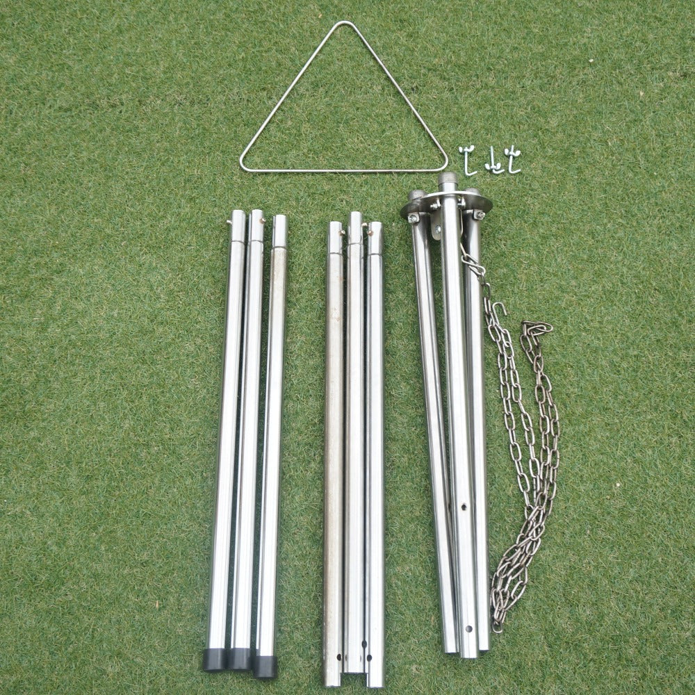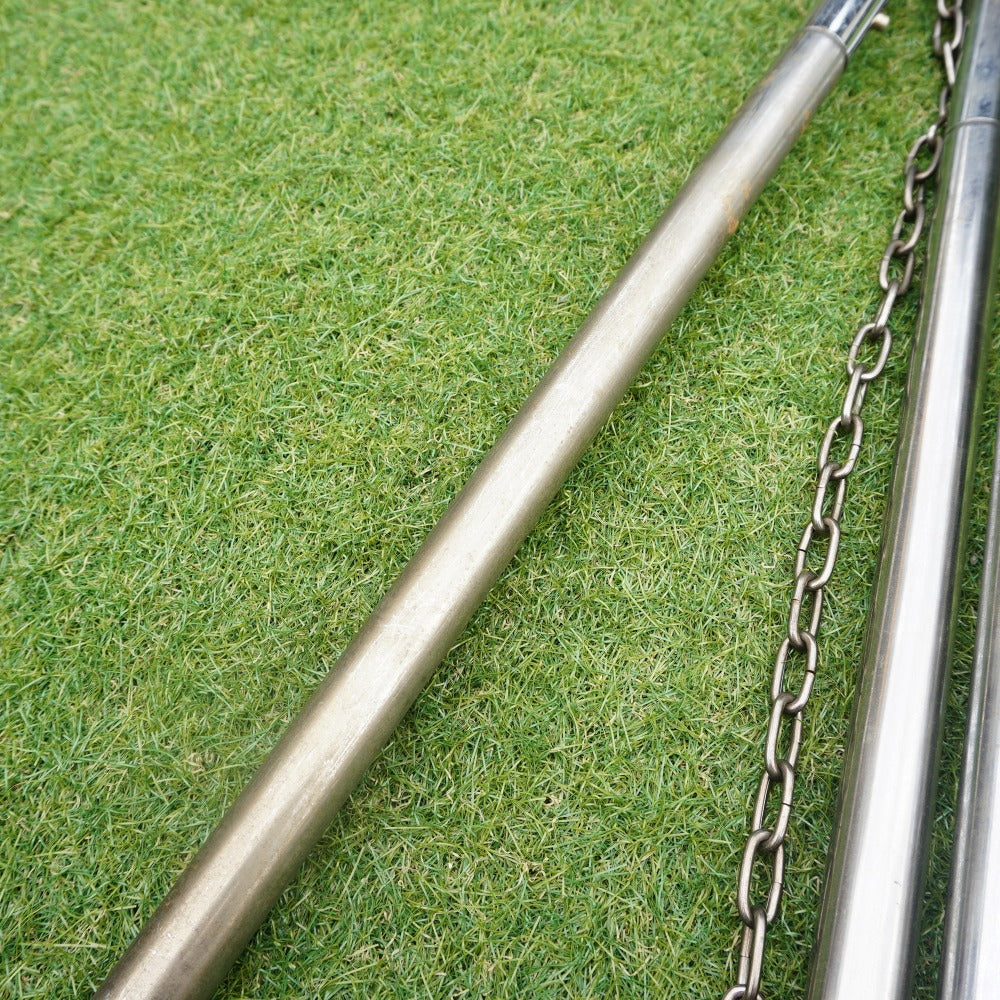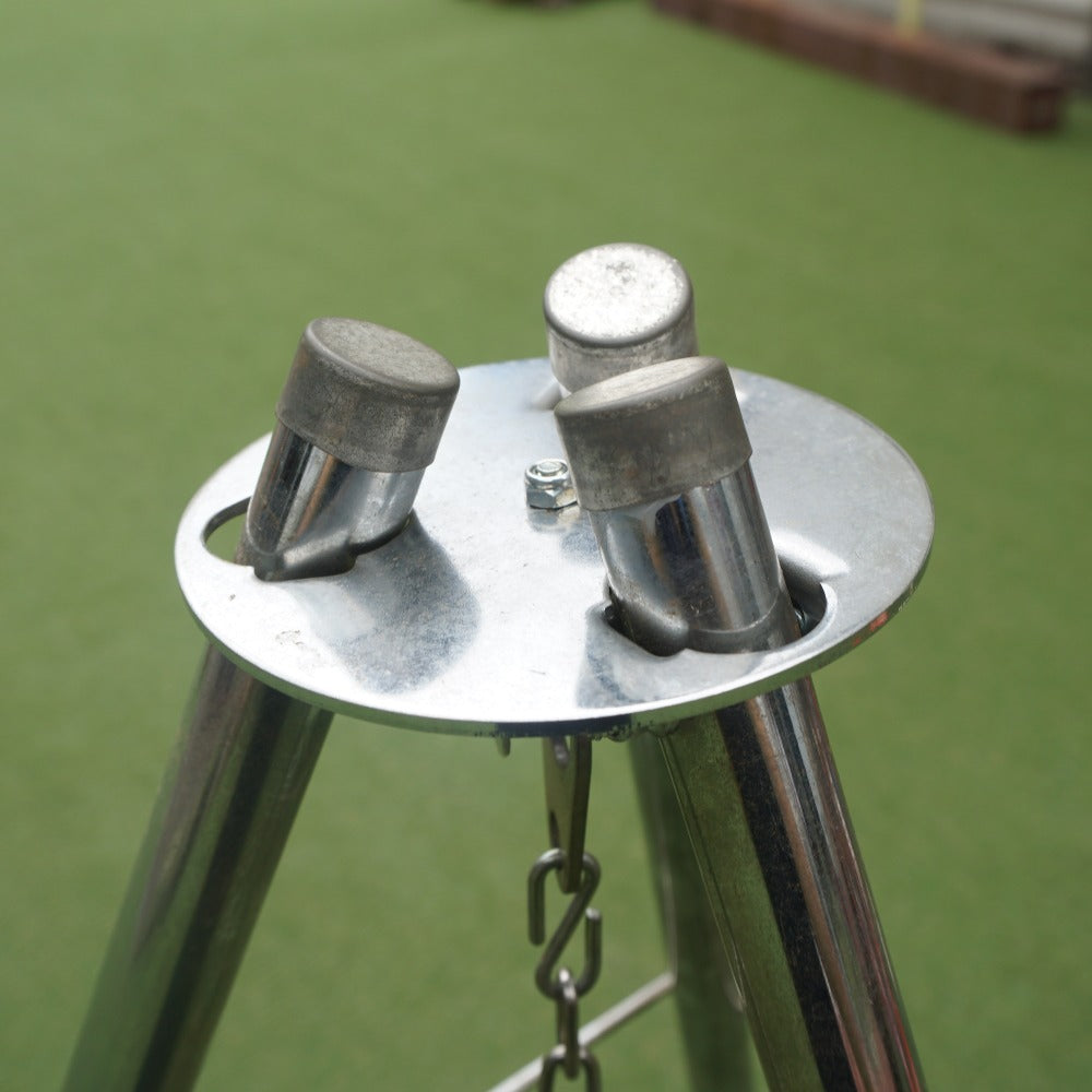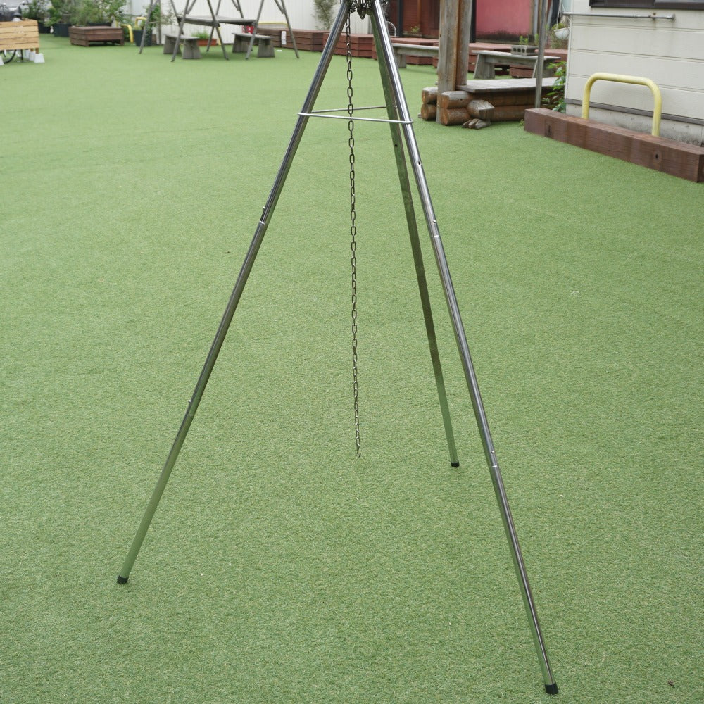 商品説明 | アウトドアギアのトライポッドです。 焚火台の上に、ダッチオーブンなどを吊り下げて使用するスタンドです。 脚の高さを2段階で調節できます。 ・収納サイズ:長さ53cm ・組立サイズ:高さ135cm、脚(地面設置面)から脚110cm |