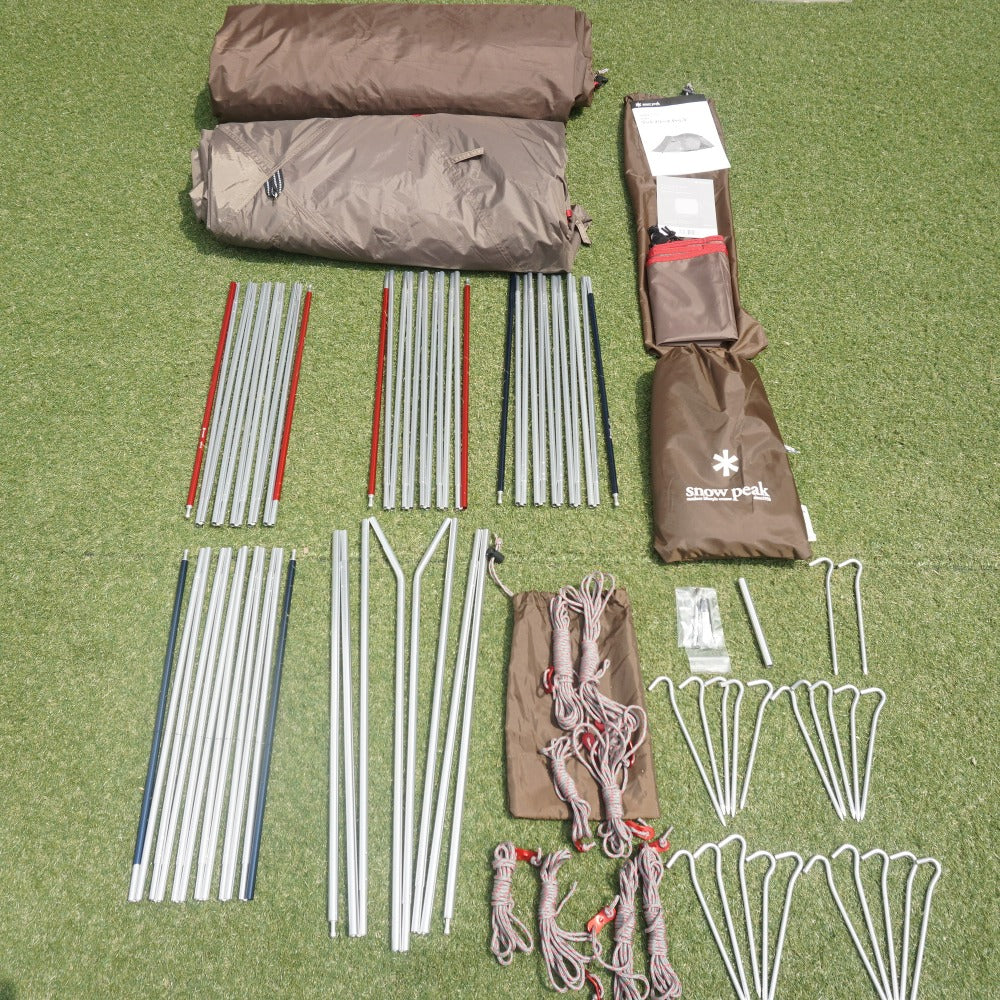 付属品 | 収納ケース 説明書、グランドシート説明書、ライナーシート、フレームケース、グランドシート 収納ケース、シームグリップ剤、リペアパイプ、ジュラルミンペグ22本、自在付ロープ8本(二又用5m×2/3m×4/2m×2)、ペグケース |