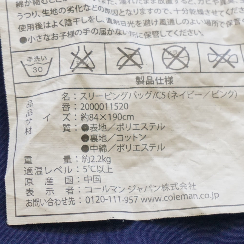 商品説明 | コールマンのスリーピングバックC5 ネイビー/ピンクです。 5度以上の気温に対応しているため、春や秋にぴったりな寝袋です。 |