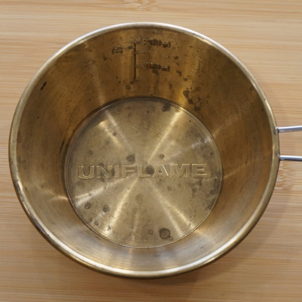 商品説明 | ユニフレームのUFシェラカップ300 ブラスです。 容量が300mlで、目盛り付きのシェラカップです。 本体材質:真鍮 |