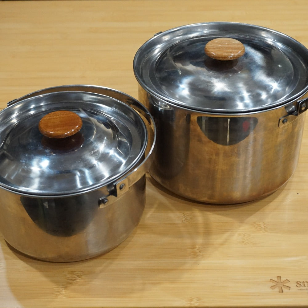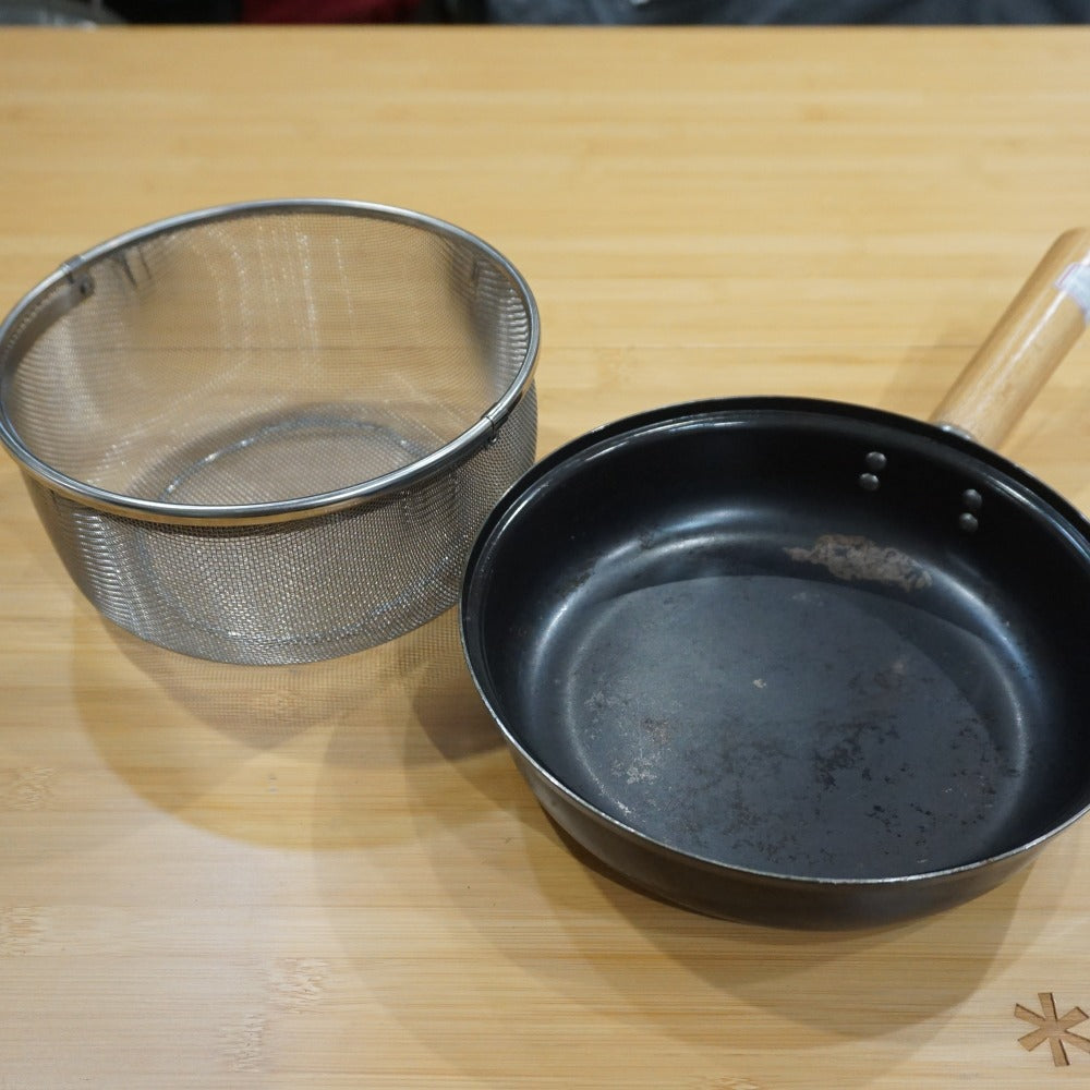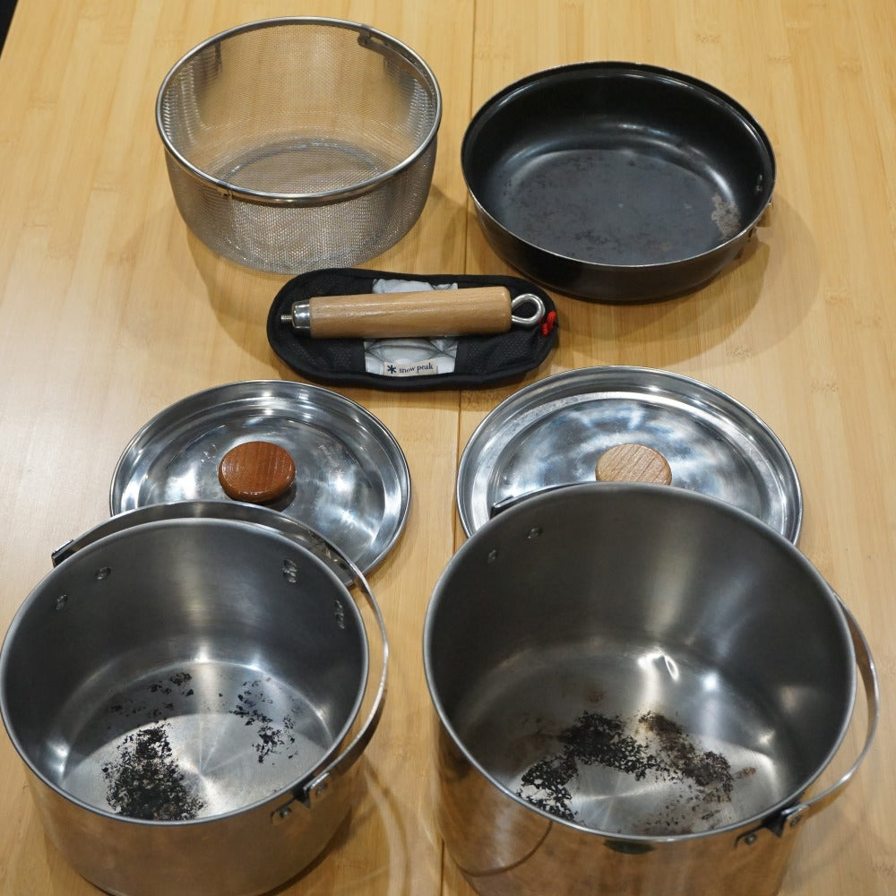商品説明 | スノーピークのフィールドクッカーPro.3/CS-023です。 2サイズのビリーポット(鍋)と、野菜の水切りなどに便利なメッシュバスケット(ざる)、フライパンのクッカーセットです。 焚火にも対応でき、ハンドルケースは鍋つかみにもなるため、非常に便利なクッカーです。 |
