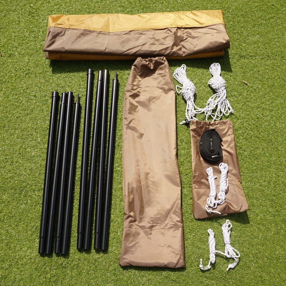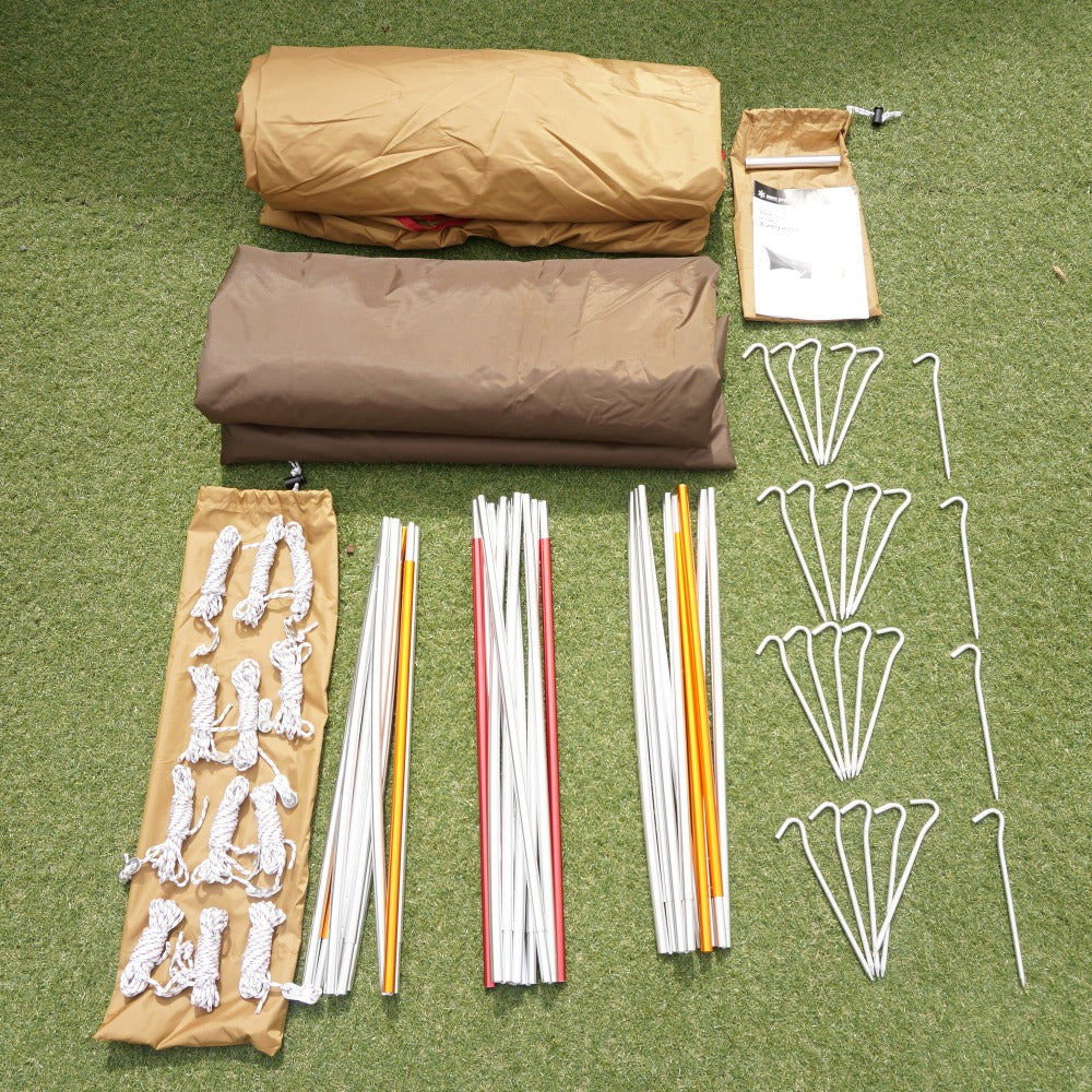 付属品 | 収納ケース 【テント】ペグケース、リペアパイプ、説明書、ジュラルミンペグ24本、フレームケース、自在付ロープ12本(3.0m×4/2.5m×8)()【タープ】コネクションテープ、自在付ロープ6本(二又用10m×2、3m×2、2m×2) 、ペグケース、ポールケース、スチールポール2本(280cm、240cm) |