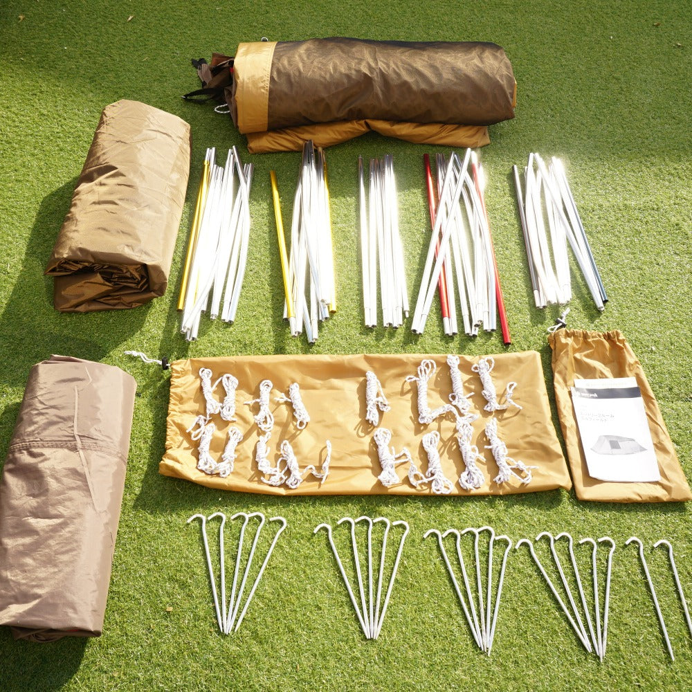 付属品 | 収納ケース ルーフシート、フレームケース、ペグケース、自在付ロープ16本(2.5m×8/1.5m×8)、説明書、ジュラルミンペグ22本 |