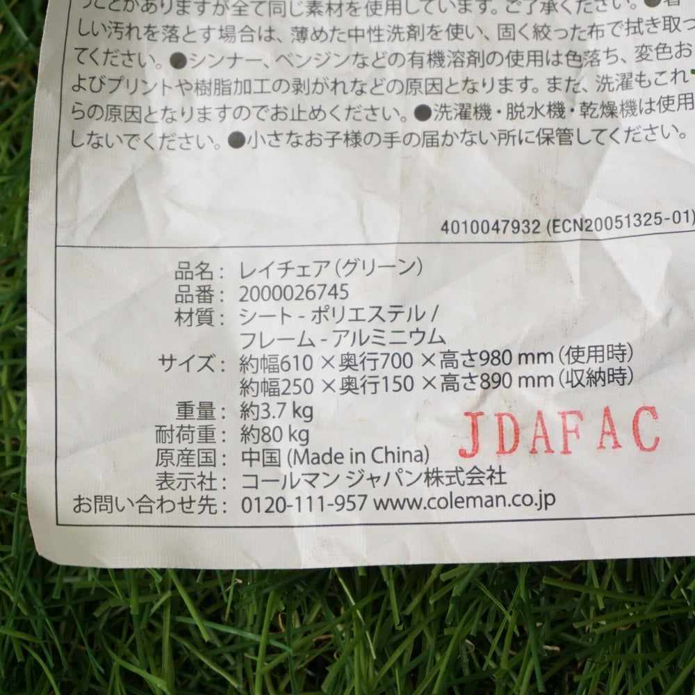 商品説明 | コールマンのレイチェア グリーン/2000026745 です。 背面のフレームを持ち上げて折り畳むと、コンパクトに収納できるチェアです。 3段階にリクライニングが可能です。 ・サイズ:幅61cm×奥行70cm×高さ98cm ・耐荷重:80kg ・重さ:3.7kg |