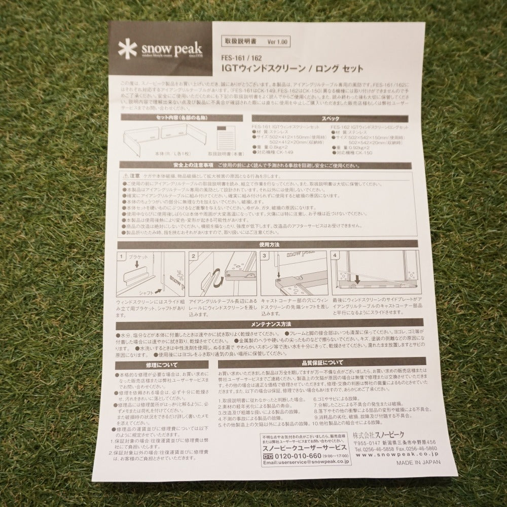 商品説明 | スノーピークのIGTウインドスクリーンロングセット/FES-162です。 雪峰祭2016秋の限定アイテムです。 IGTロングに取り付ける風防となります。 |
