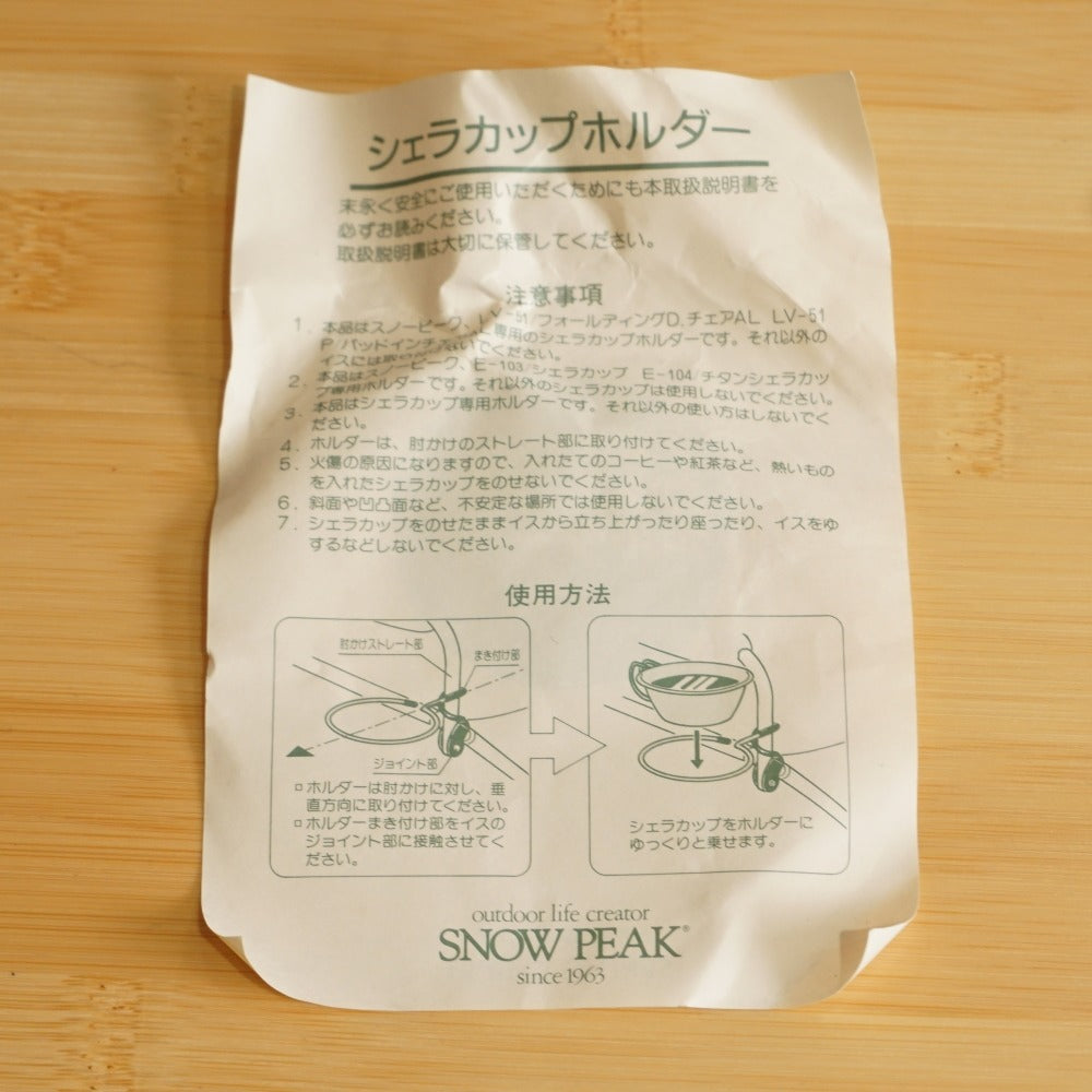 商品説明 | スノーピークのFDチェアなどに取り付けられる、シェラカップホルダーです。 スノーピークが「株式会社ヤマコウ」の時代に製造されていたアイテムです。 椅子一つで出掛けるチェアリングの際に、あると便利なアイテムです。 ※チェア、シェラカップは付属しておりません。 |