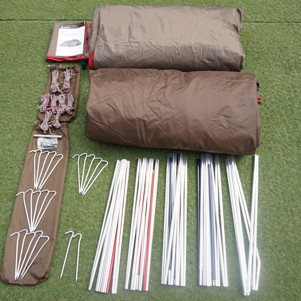 付属品 | 収納ケース ライナーシート、説明書、ペグケース、自在付ロープ8本(二又用5m×2/3m×4/2m×2)、フレームケース、リペアパイプ、シームグリップ剤、ジュラルミンペグ22本 |