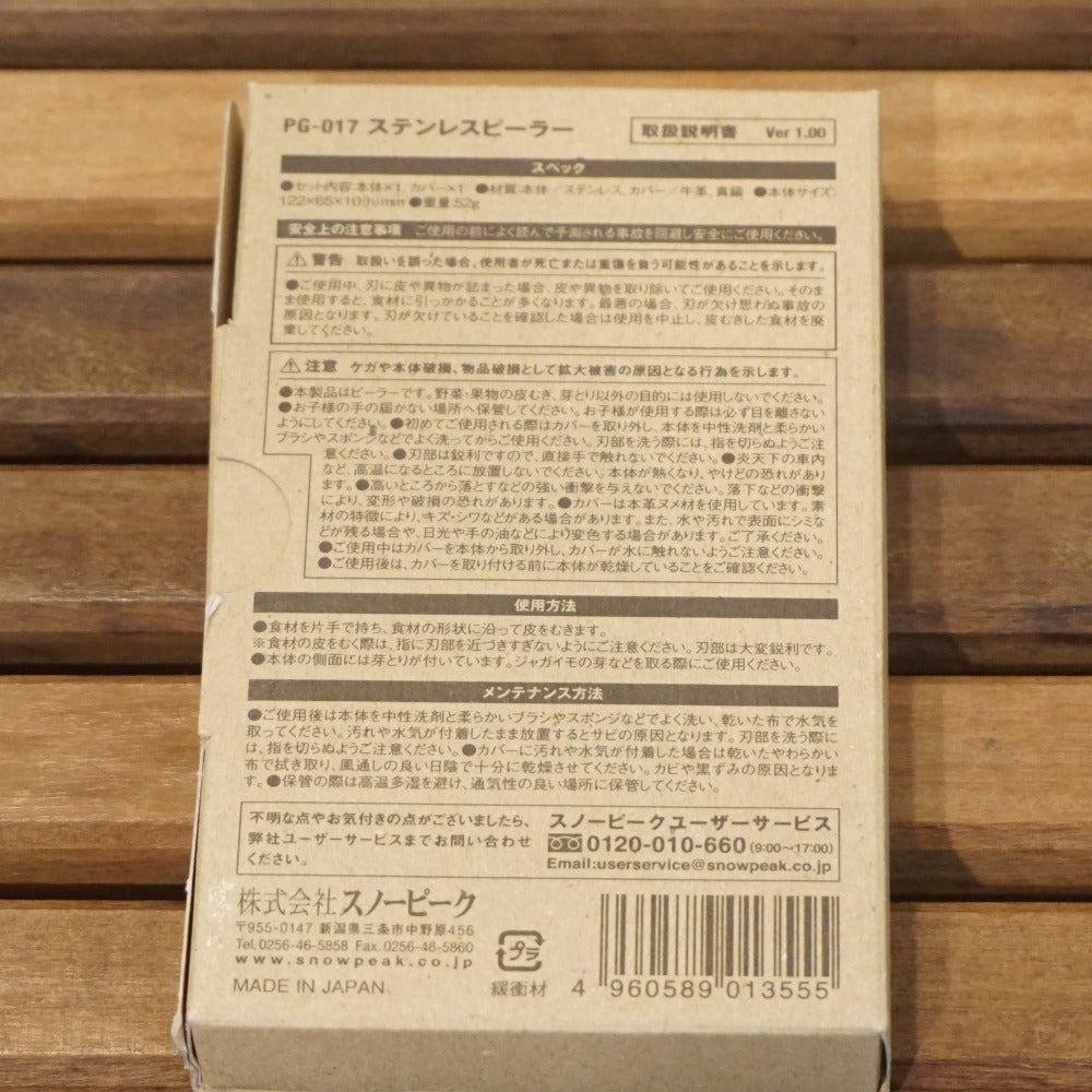 商品説明 | スノーピークのポイントギフト、ステンレスピーラー/PG-017 です。 切れ味鋭いステンレス製のピーラーです。 本革(牛革)のカバーが付属しております。 スノーピークポイント会員限定の交換ギフト商品のため、非売品です。 交換ポイント:3,500ポイント |