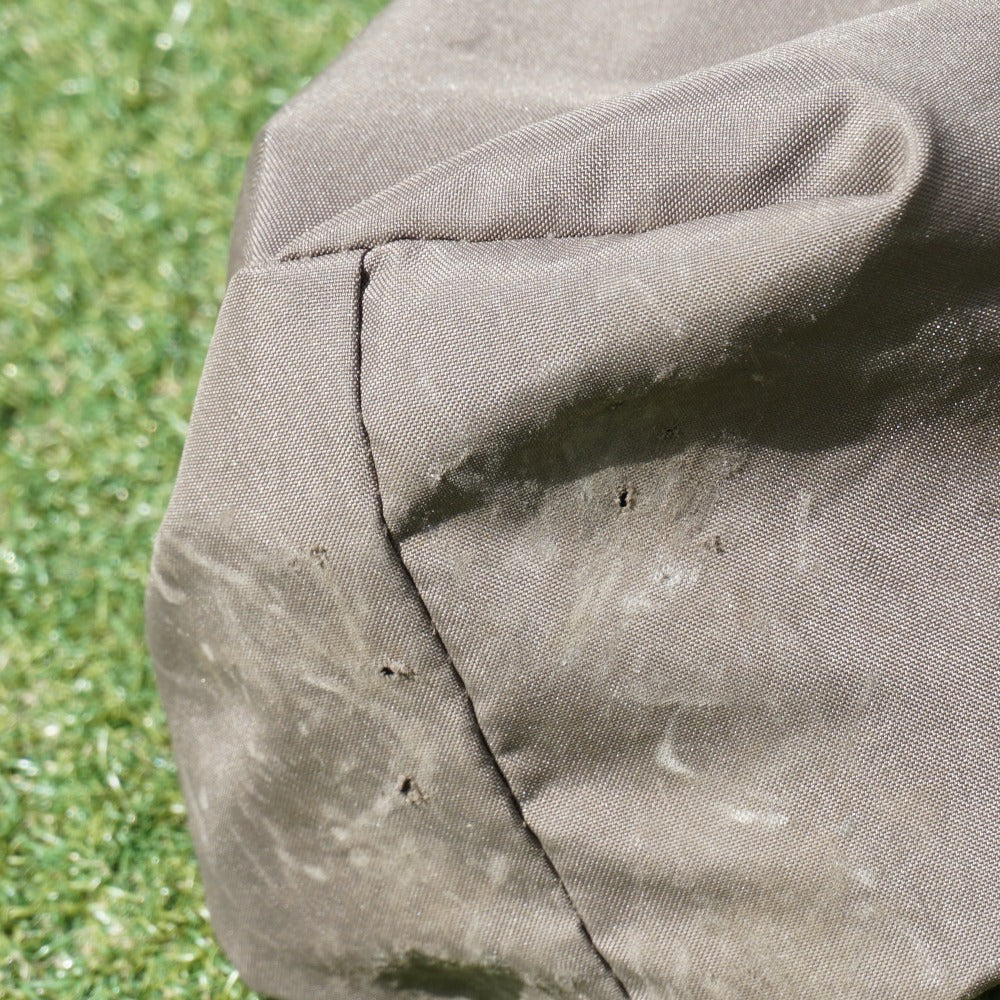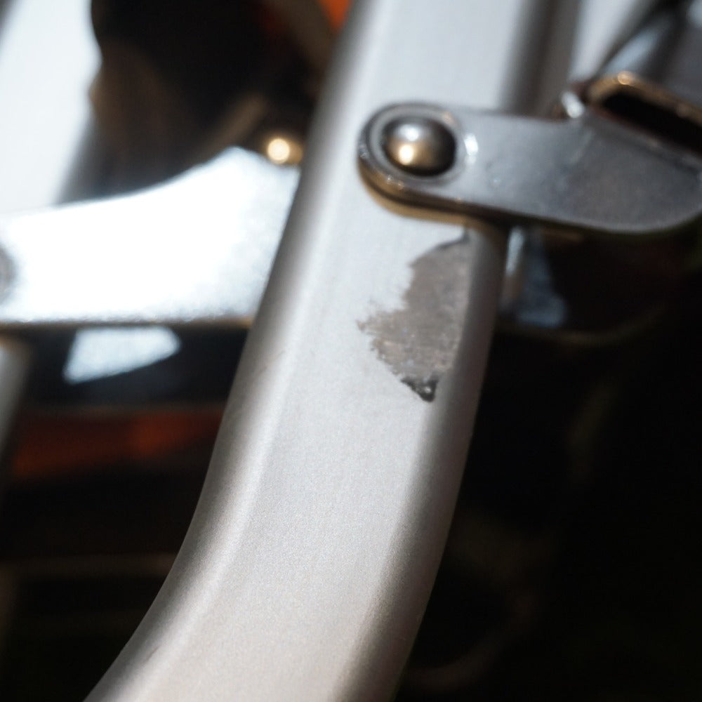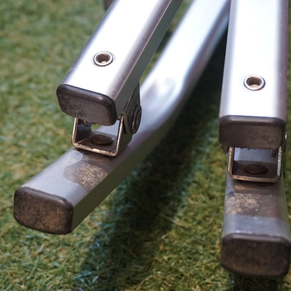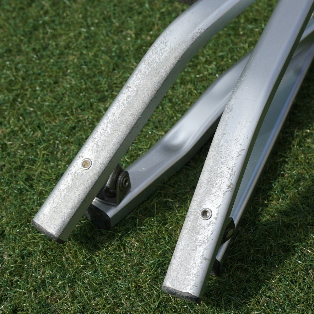 フレームの先端に取り付ける、黒色のキャップが2か所紛失しておりますが、 接地面ではなく座面と背面を繋ぐ部分のため、 使用に支障となるような影響はないと思われます(画像2枚目参照)。 また、接地面などに傷や、座面にシミ汚れ・色褪せなど、 使用感はございますが、フレームに変形などないため、まだまだお使いいただけます。 中古品であることをご理解いただき、状態を過度に気になさる方は購入をご遠慮ください。 |