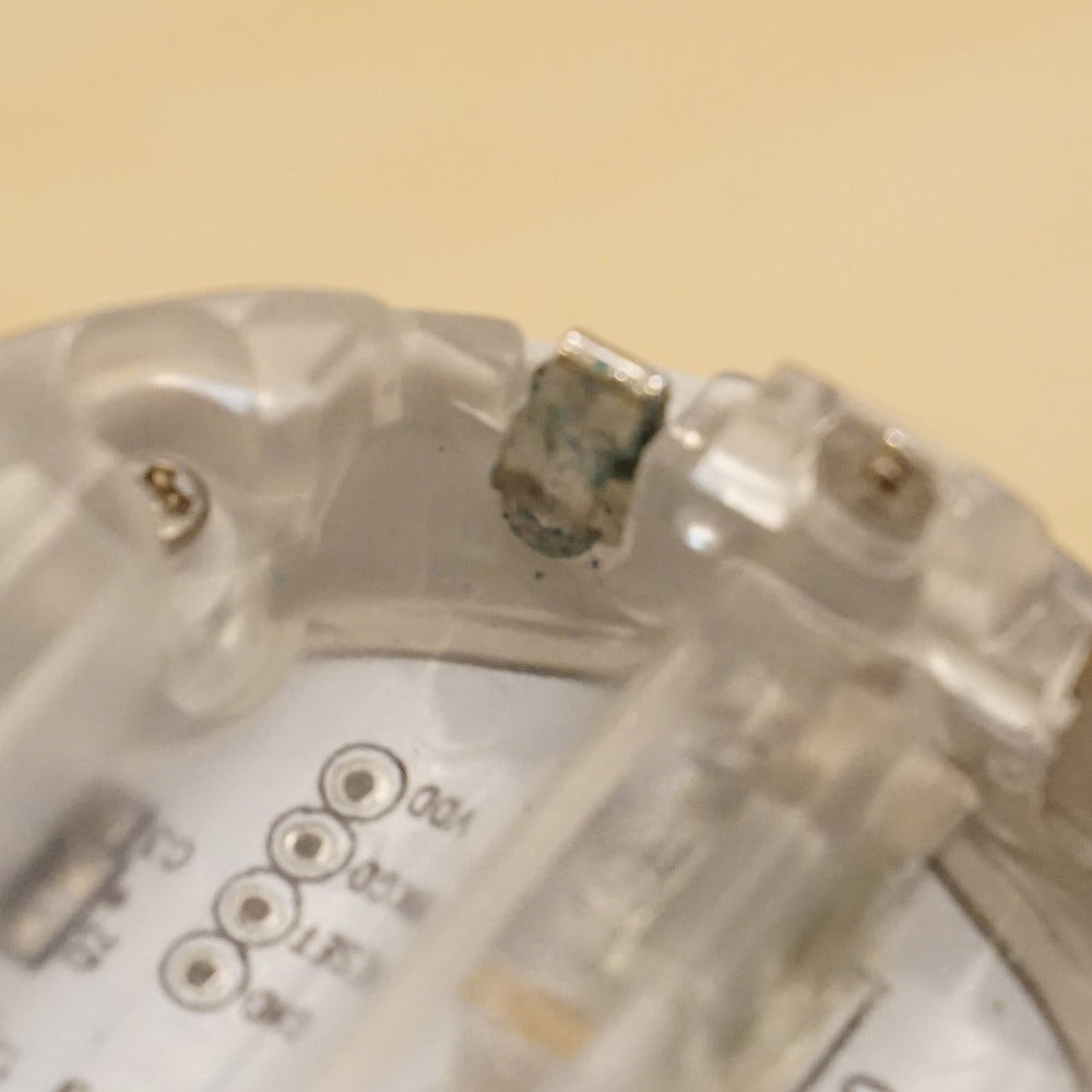 シェードの上部に1㎜以下の穴が2か所ございます(画像2枚目参照)。 また、電極に劣化が見られますが、 点灯は問題なく、外見も目立った汚れなどはございません。 |