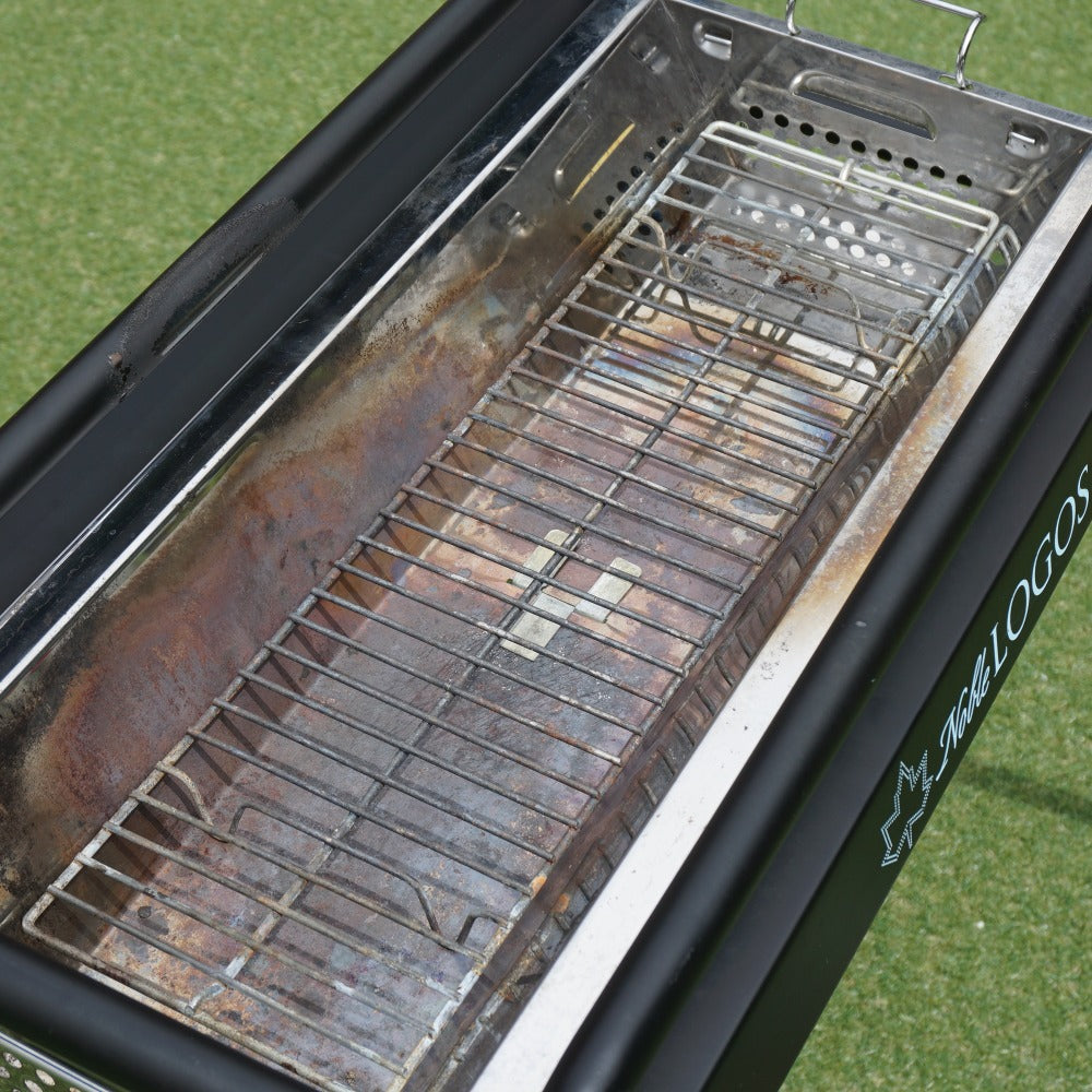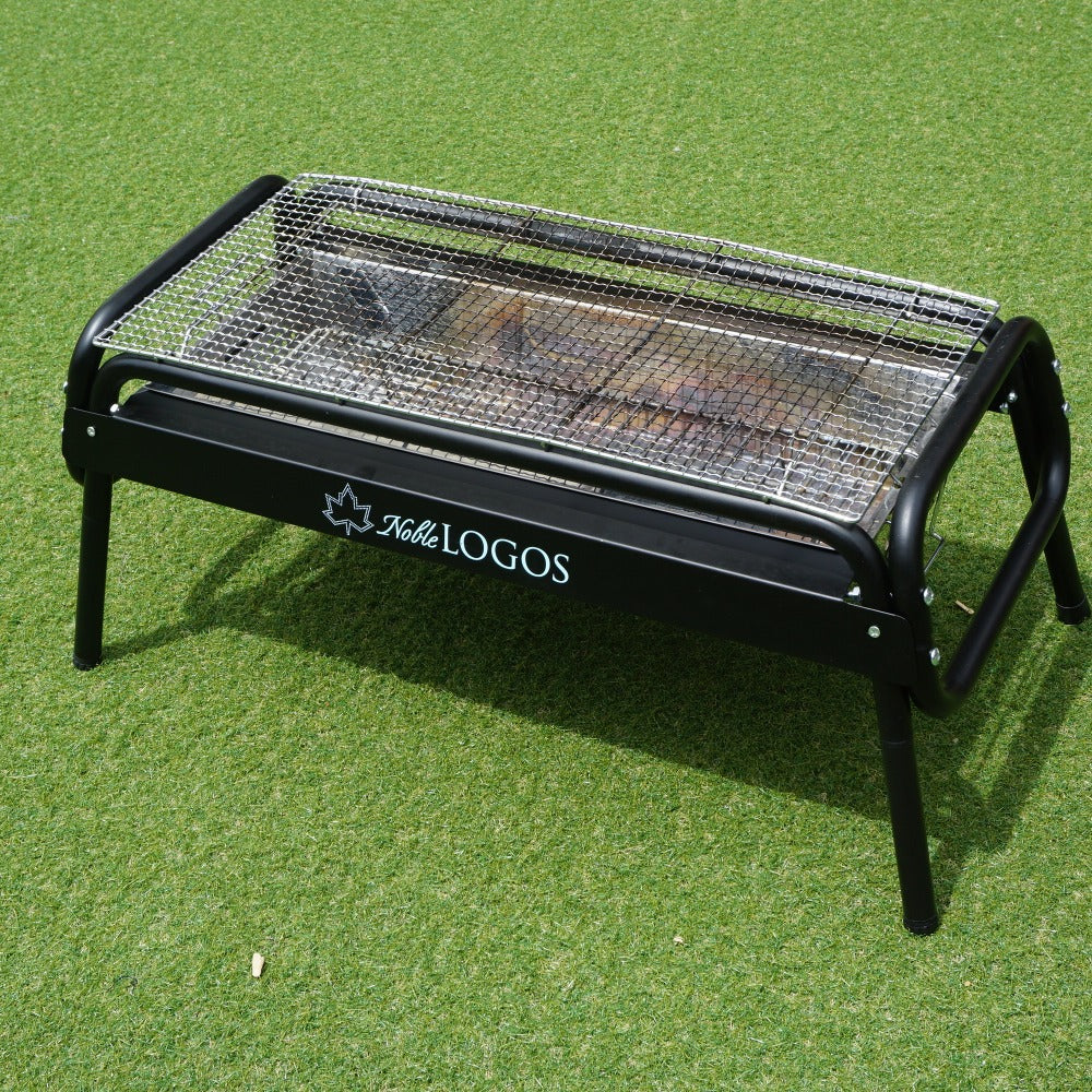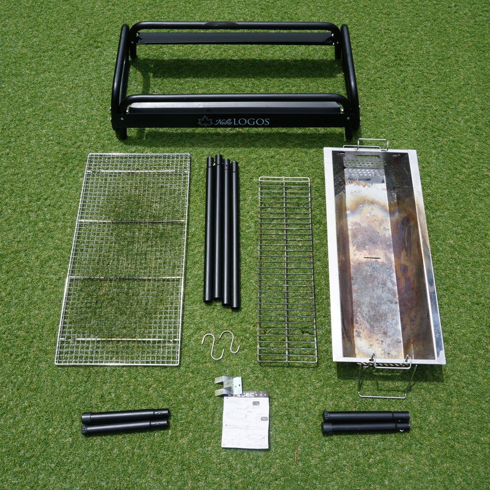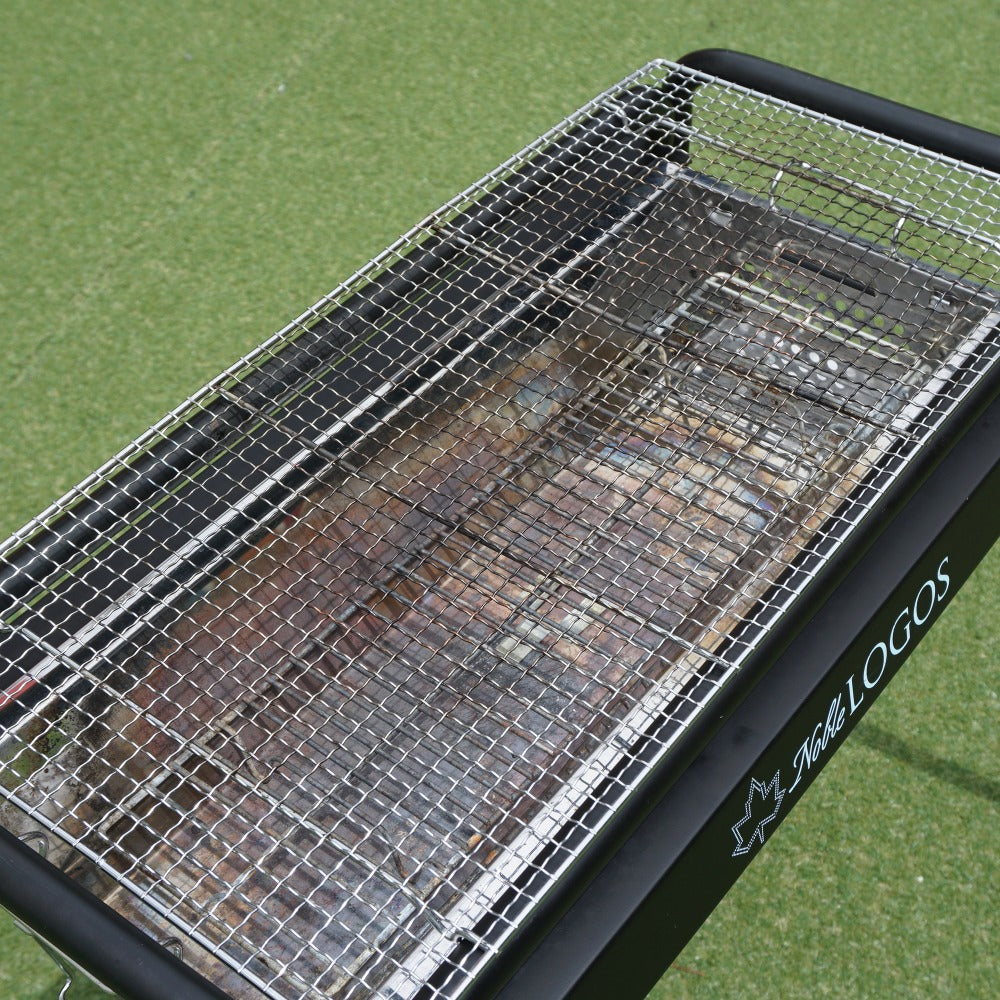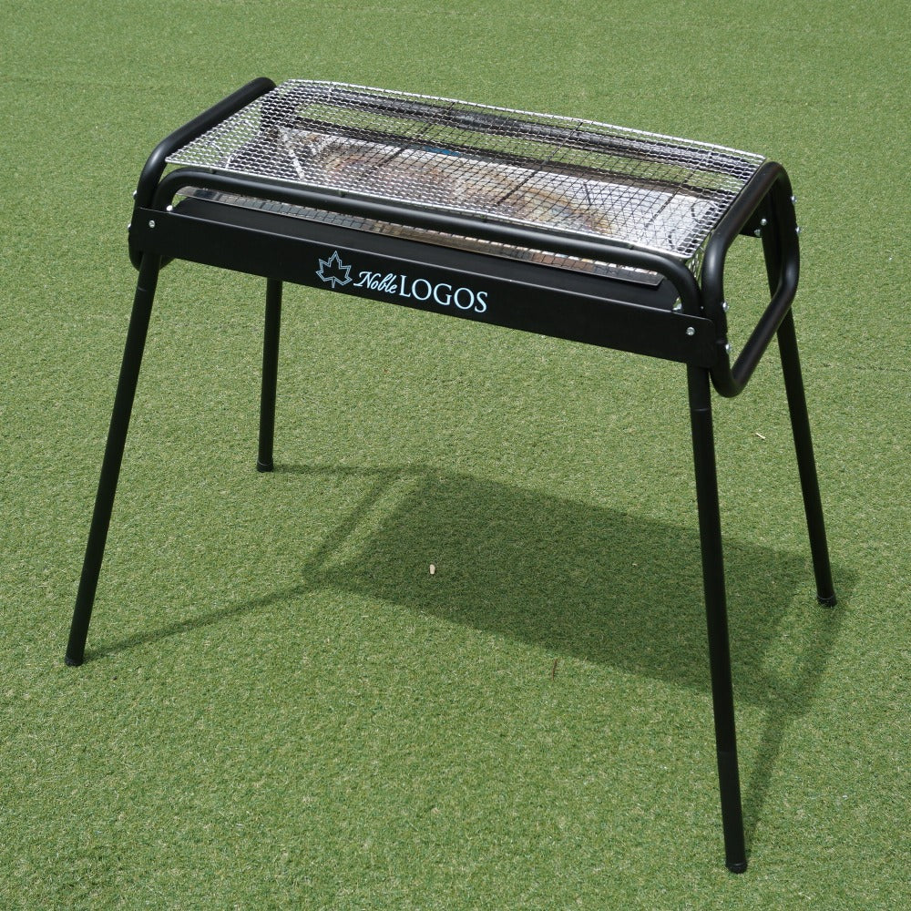 商品説明 | 「Noble LOGOS」のロゴがプリントされた、ハイブリッドチューブラルグリルL です。 火床が簡単に取り外せて、片付けがしやすいBBQグリルです。 高さはハイ・ローの二段階に調節できます。 |