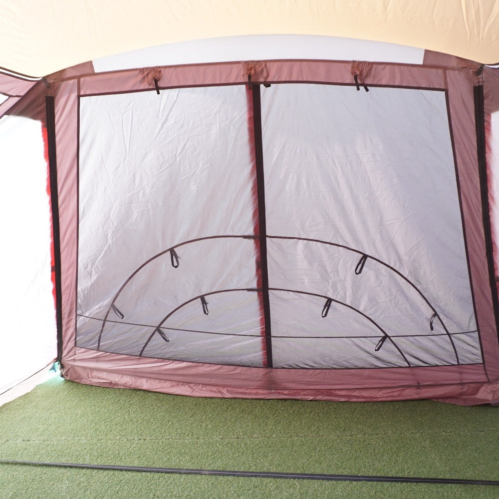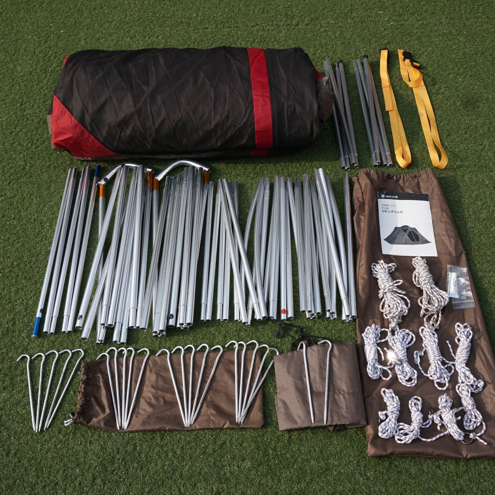 付属品 | 収納ケース アップライトポール2本、コンプレッションベルト2本、説明書、シームグリップ剤、自在付ロープ10本(二又用7m×2、3.5m×4、2m×4)、フレームケース、三角ポケット、ジュラルミンペグ22本、ペグケース |